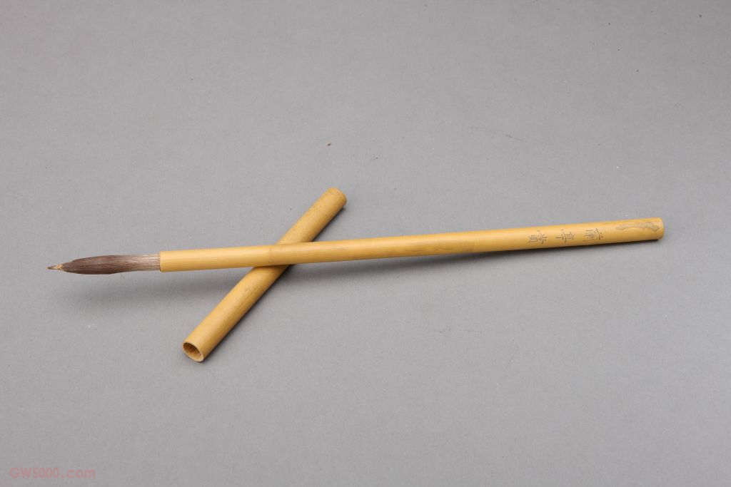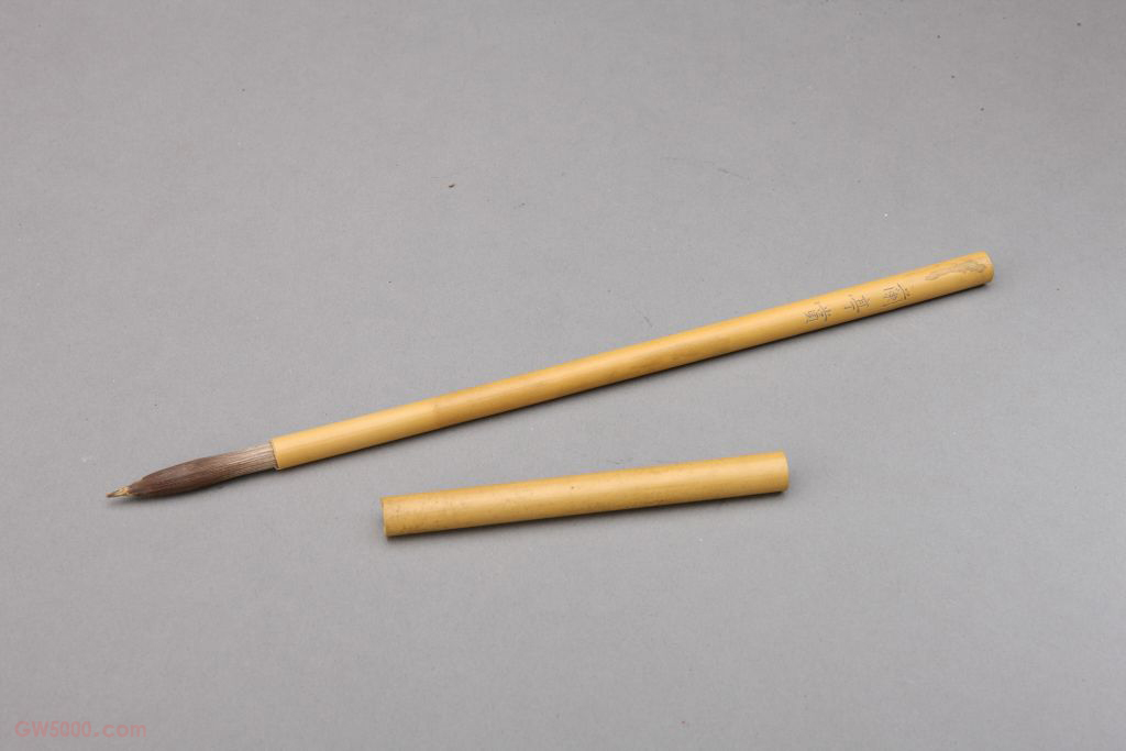 竹管兰亭赏狼毫笔,清乾隆,笔管长19.5厘米,管径0.85厘米,帽长9.6厘米,帽径0.9厘米,毫长4厘米。 笔为竹制,管上书蓝色“兰亭赏”阴文楷书三字。笔纳紫毫,笔毫为兰花蕊式。即黄鼠狼尾上之毛。有嫩黄、黄色、黄中略带红色、黄褐等颜色。毛较长,手感光滑柔润,抚摸时有软缎之感。 篆刻的一种方式,即把印文镌成凹状,在纸上钤盖时印文是白色,因而又称为白文。 为野兔脊背上一小撮紫黑色弹性极强的箭毛,也称箭毫。紫毫比普通兔毛坚长健利,稀少而名贵。唐诗人白居易《紫毫笔》诗称:“宣州之人采为笔,千万毫中拣一毫。每年宣城进笔时,紫毫之价如金贵。”