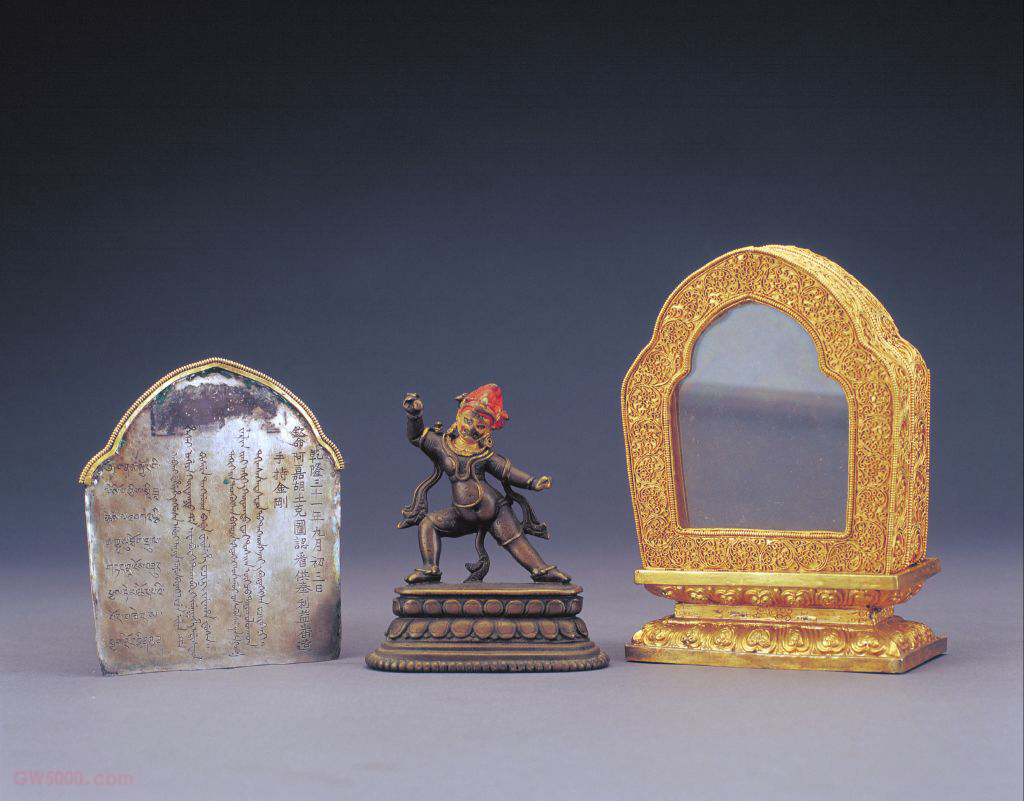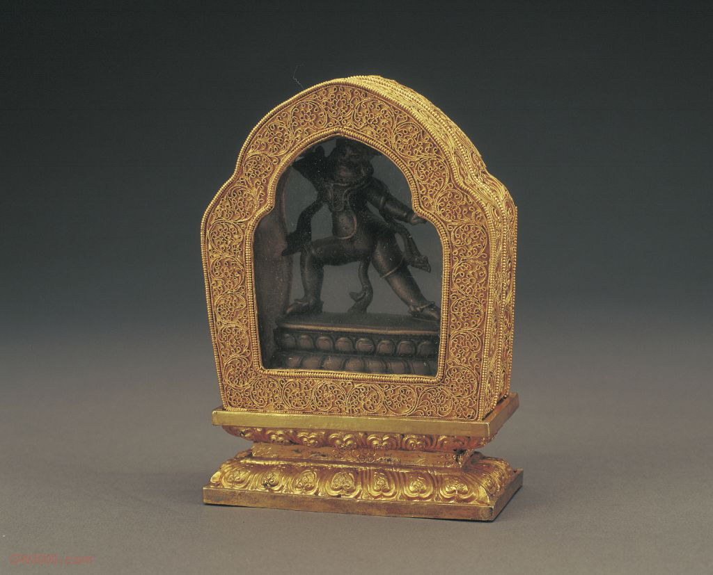 八成金带座佛龛,清,通高12.5厘米,长8.6厘米,宽4.6厘米。 佛龛八成金质,正面镶玻璃,周边为累丝缠枝莲花纹。佛龛顶部、底部及侧面均饰累丝卷草纹。背面有银质插门,周边亦为累丝缠枝莲花纹。插门上刻汉文“乾隆三十一年(1766年)九月初三日,钦命阿嘉胡士克图认看供奉利益番造手持金刚”31字以及满文、藏文题记。佛龛下部有金座,束腰式,錾刻莲瓣纹。座底刻佛花一朵。佛龛内供奉一尊小佛像,佛的头部描金,右手持金刚杵一。 此佛龛质地优良,小巧精致,是藏族僧人和信徒们为了表示虔诚,随身携带用以随时随地供佛的小佛龛。 我国古代金工传统工艺之一,又名“花作”或“花纹”,为金属工艺中最精巧者。它是将金银拉成丝,然后将其编成辫股或各种网状组织,再焊接于器物之上,谓之累丝。立体的累丝作品制作最难,须事先经“堆灰”的手续。所谓“堆灰”,即把炭研成细末,用白芨草泡制的粘液调和作为塑料,塑成人物或走兽等所要制作的物象,然后再在上面进行累丝,用焊药焊连,之后置于火中把里面的炭模烧毁,即成立体中空剔透玲珑的精美艺术品。 中国传统装饰花纹之一。所绘花朵系以植物的枝干或蔓藤作骨架,枝叶相互缠绕,构成四方连续或二方连续的图案,统一中寓变化。有缠枝莲、缠枝菊、缠枝牡丹和缠枝宝相花等多种纹样。 莲花作为佛教的标志之一,象征纯洁,缠枝因枝蔓连绵不断,具生生不息之意。缠枝莲花纹是寓意吉祥的传统装饰纹样。 中国传统装饰花纹形式之一。其绘花朵上下周转,枝叶相互缠绕成图案形式,有缠枝莲、缠枝菊、缠枝牡丹等。以莲花为主题者,称缠枝莲。莲花是随佛教的传入而在中国的工艺品上流行开的。魏晋南北朝时佛教艺术在中国大为盛行,莲花便作为佛的象征而广泛出现在中国的工艺品上。南北朝时瓷器上的莲花瓣装饰十分普遍,成为这一时期瓷器装饰的标志性的纹样。此后,莲花就成为瓷器装饰中最普遍的纹样之一。 瓷器纹饰,又称卷叶纹或卷枝纹,宜于作各种器物的辅助纹饰。 17、18世纪传入中国的一种装饰花纹。俗称西蕃莲,如果没有花朵,则称为卷草。束腰,明清家具部件名称。原是须弥座上枭与下枭之间的部分,在家具上指面框和牙条之间缩进的部。束腰是我国传统家具造型的典型式样之一。金属工艺的一种。即用工具剔除地纹,使纹饰轮廓线凸起。錾金工艺技法早在商代就已出现,到清代,被广泛地运用于各种金属工艺品上。 莲花俗称“佛花”,莲瓣纹是佛教文化影响下流行的纹饰。南北朝时期由于佛教文化盛行,瓷器上常用莲瓣纹做装饰。隋初瓷器装饰也受此风影响。瓷器装饰手法之一。其工艺是以毛笔蘸调和好的金粉,在烧好的瓷器上描绘图案花纹,然后入炉经低温烘烧而成。描金创烧于北宋定窑,南宋人周密《志雅堂杂钞》记载:“金花定碗用大蒜汁调金描绘,然后再入窑烧,永不复脱。”用大蒜汁调和金粉是利用其天然的粘性。明清的景德镇御窑厂亦常用描金装饰颜色釉瓷器,如著名的宣德鲜红釉描金器、弘治黄釉描金器、乾隆窑变釉描金器等。 原为古印度的一种兵器,佛教密宗中为摧毁妖魔的法器。