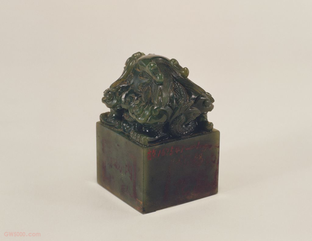 “心清闻妙香”印,清乾隆,碧玉质,龙纽方形玺,汉文篆书。面4.4厘米见方,通高6.7厘米,纽高3.4厘米。 “心清闻妙香”语出杜甫诗《大云寺赞公房四首》之三。原诗为:“灯影照无睡,心清闻妙香。夜深殿突兀,风动金琅珰。天黑闭春院,地清栖暗芳。玉绳迥断绝,铁凤森翱翔。梵放时出寺,钟残仍殷床。明朝在沃野,若见尘沙黄。”乾隆帝择此句刻入宝玺,与杜甫当时之心境不同,而是以心清自比,以妙香喻外,盖言身处太平之世,身心俱佳,得无限清幽之乐。 碧玉是新疆和阗软玉中的一个品种,软玉主要有白玉、青玉、碧玉、墨玉、黄玉等品种。其中碧玉色如菠菜叶,略有透明感,呈油脂或蜡状光泽。由于所含成分不同,颜色和结构均不如其它软玉均一,色彩淡的呈菜色,色彩深的呈墨绿色,还有斑杂的大环斑状。 杜甫(712—770年),字子美,唐朝诗人,有“诗圣”之名。其诗具有很强的现实主义倾向 。《三吏》、《三别》、《秋兴》、《春望》等诗篇广为传颂。