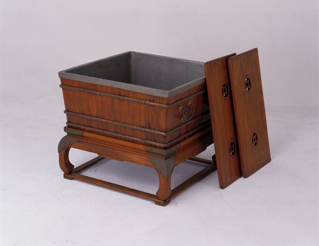 清,高82厘米,长91厘米,宽90厘米。 冰箱外部为柏木质。箱上有一对箱盖,盖上有四个铜钱纹开光,用于将箱盖提起。箱内设一层格屉。盛夏时节,天气炎热,在格屉下放置冰块,将食品置于屉板之上,而箱内四壁用铅皮包镶,可以隔绝外面的热气进入箱内,利于冰块保持低温,对箱内储藏的食品起到冷冻保鲜的作用。冰箱外部的两个侧面各安两个铜提环,以便提拉冰箱之用。冰箱下承柏木座,座面、束腰及鼓腿拱肩处均包镶铜片,足下连托泥。此冰箱造型简洁实用,设计巧妙,颇具实用性。家具用材,亦称“垂柏”。柏科,常绿乔木,产于我国长江流域及以南地区,生长快,木材为淡黄褐色,材质细致,气味芳香。 我国传统装饰技法之一。即为使器物上的装饰变化多样或突出某一形象,往往在器物的某一部位勾勒出某一形状(如扇形、蕉叶形、菱形、心形、桃形、圆形等)的空间,其内饰以图纹。 包镶指用一般木材造胎骨、以薄片硬木造贴面的家具工艺。束腰,明清家具部件名称。原是须弥座上枭与下枭之间的部分,在家具上指面框和牙条之间缩进的部。束腰是我国传统家具造型的典型式样之一。有束腰的家具腿上端由于束腰缩进而形成的肩膀称为“拱肩”。传统家具上承接腿足的部件。明清家具中有的腿足不直接着地,另有横木或木框在下承托,此木框即称为“托泥”。有的托泥之下还有小足,小足才是真正落地的部位。此部件多见于条案、几类等传统家具,以增稳重之感。