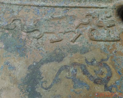 此壶颈部采用浅浮雕手法铸出一周突起的象纹,象纹简洁而抽象,通过庞大的身躯、长卷的鼻子表现出大象的主要特征。壶的腹部用嵌赤铜工艺装饰龙纹。嵌赤铜的制作工艺相当复杂,铸器时在体表预留出凹槽,再注入赤铜而成。用此法铸造,金属的配比和烧铸时火候的掌握都必须准确,需要很高的技巧。