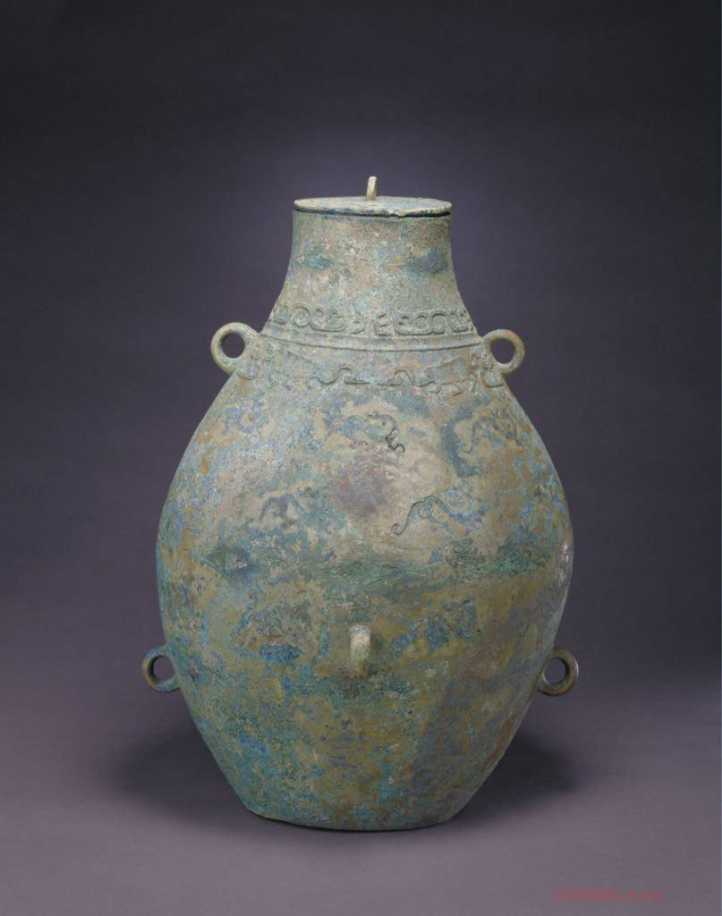 器直口,粗颈,鼓腹,器形硕大,有平盖,环形钮,是一种大型的盛酒器。壶身正面有一系环,另在肩部两侧及腹部靠下处铸有对称的两对系环。由于此器庞大,若盛满酒再加上自重必难移动,故设计了系环用以穿绳,以便于搬运携带。