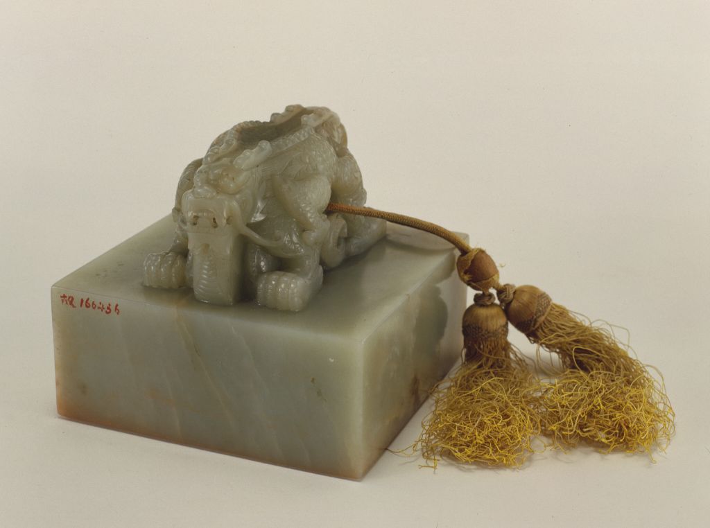“文华殿宝”,清乾隆,青玉质,交龙纽方形玺,汉文篆书。面12.8厘米见方,通高10.6厘米,纽高5厘米。附系黄色绶带。 文华殿是紫禁城内位于太和殿东面的一组建筑,自成体系,始建于明永乐十八年(1420)。最早为皇太子的东宫,嘉靖帝时改为皇帝斋戒时的居所和接见大臣的地方。这里也是皇帝举行御经筵的宫殿。经筵,即御前讲席,讲官先讲解《四书》《五经》中的某些议题,皇帝再阐发义理。明朝早期无定月,亦无定日。正统初年始为常仪,每月初二日御定文华殿进讲,每月三次。万历时分春讲和秋讲。清承明制,仍以文华殿为经筵之地,康熙二十四年(1685)定每年二月八日举行,以大学士、尚书、左都御史、侍郎、学士、詹事充任经筵讲官,满汉各八人,以后虽经筵细节稍有变化,但其制不改。文华殿在太和殿之左,协和门之外,明嘉靖朝以前为皇帝之便殿,以后用为皇帝讲经筵之所。清袭明制。明中期,这里是皇太子摄政之地。明光宗崩,大臣刘一燝、杨涟等将皇太子从乾清宫扶至文华殿,遵其前制故。