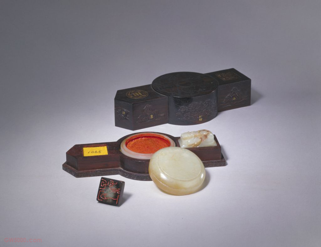 此二玺是乾隆著帝名的鉴赏类印章,二玺相互配套使用,共贮于紫檀木圭璧式匣内。匣盖两端错金圆双龙捧乾卦和方双龙捧“隆”字玺,四周浅浮雕“天保九如”图案,底错银“乾隆御用”四字。同匣装有青玉圆形印泥盒。