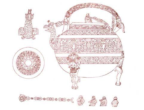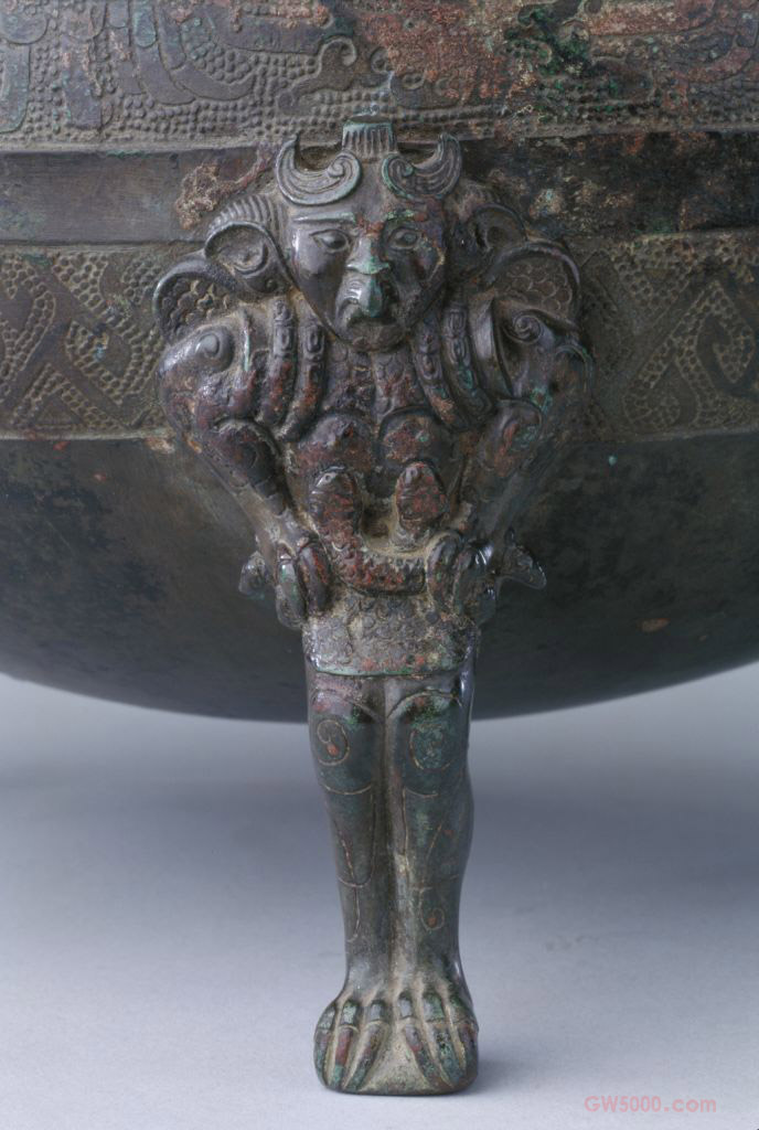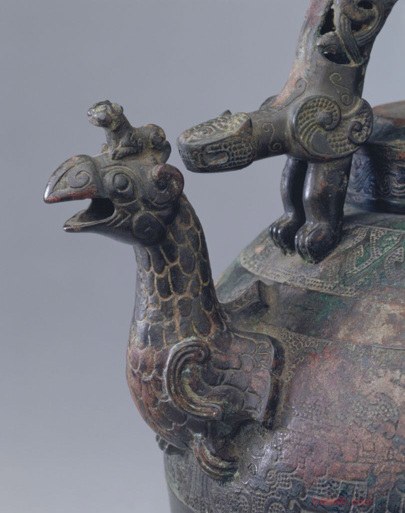 提梁整体作镂空螭形,螭首扁平,尾下垂,有四爪,螭身弓起,呈桥状,首、尾分别置于器口两侧肩部,这种镂空螭梁在青铜器中是比较少见的。盖顶正中有一猴形钮,猴曲腿蹲坐,颈上套一环,环上有链,猴单爪握链,链的另一端与梁上的环钮相连。猴的神态自然生动。流作鸟首形,鸟首顶上伏卧一小虎。三足为站立的怪兽,人面鸟咀,额上有双角,身侧有两翼,前爪左右各抓一蛇,形象奇诡。
