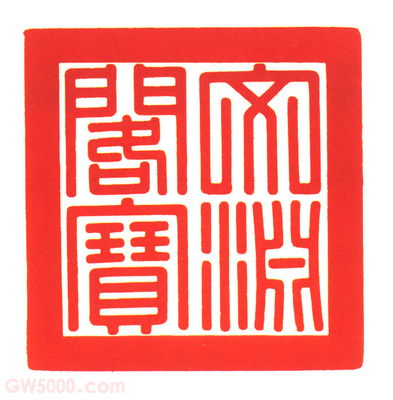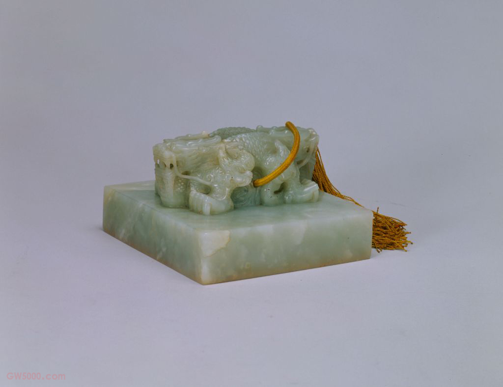 “文渊阁宝”,清乾隆,青玉质,交龙纽方形玺,篆书。面12.7厘米见方,通高9.5厘米,纽高4.9厘米。附系黄色绶带。 文渊阁位于文华殿后,是著名的宫廷藏书处。清代《四库全书》正本和《古今图书集成》两部大百科全书就藏在这里。乾隆四十七年(1782),《四库全书》第一部告成。乾隆帝谕:自四月四日始,每册用御宝二。前曰“文渊阁宝”,后曰“乾隆御览之宝”。说明此宝是专门钤盖在文渊阁本《四库全书》上的宝玺。帝后宝印的纽制之一。其纽形为两条相向的龙躯体合二为一。 文华殿在太和殿之左,协和门之外,明嘉靖朝以前为皇帝之便殿,以后用为皇帝讲经筵之所。清袭明制。明中期,这里是皇太子摄政之地。明光宗崩,大臣刘一燝、杨涟等将皇太子从乾清宫扶至文华殿,遵其前制故。 我国古代最大的丛书,清代乾隆皇帝敕辑。乾隆三十八年(1773年)诏开“四库全书馆”,裒辑《永乐大典》之散篇,并收罗天下之遗书,参其事者4400余人,历时10年完成。《四库全书》分经、史、子、集四部,故名“四库”。共3400余种,79300卷,凡6114函,36381册,约9亿9千7百万字。内容涉及广泛,对整理保存古代文献起了极大作用。<BR> 《四库全书》以丝绢作书皮,其中经部书用褐色绢,史部书用红色绢,子部书用黄色绢,集部书用灰色绢,分别贮于楠木书匣中,再放置在书架上,十分考究。《四库全书》前后共抄录七部,其中以文渊、文源、文津三阁藏本最为精致,疏漏较少;文宗、文汇、文源各本已亡失。现存四部中,文渊阁本现藏台北故宫博物院;文津阁本现藏北京图书馆;文溯阁本现藏甘肃省图书馆;文澜阁本散佚后补抄复原现藏浙江省图书馆。