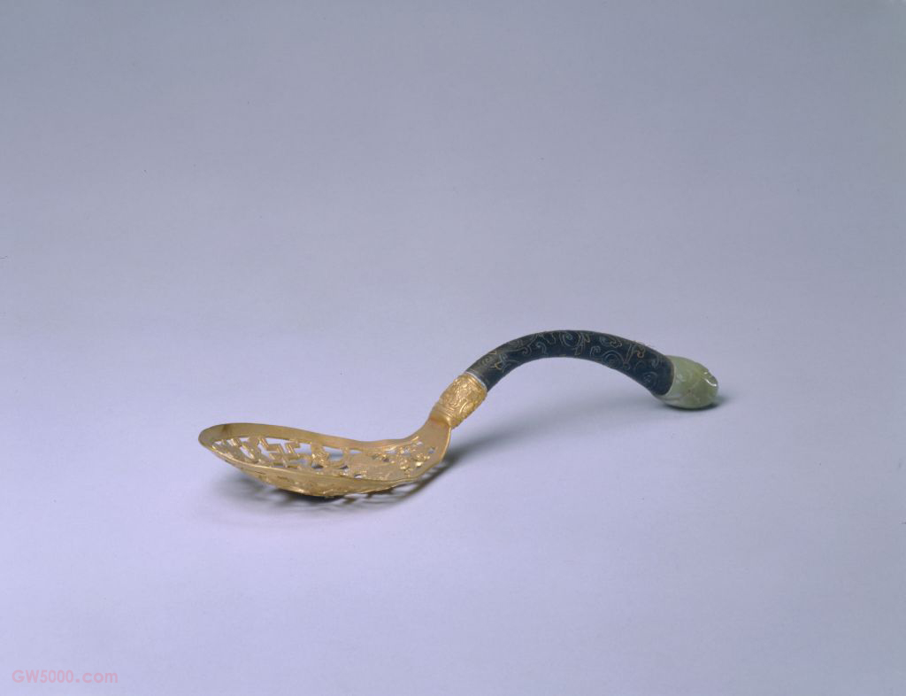 金嵌紫檀柄玉顶漏匙,清,通长17.9厘米,最宽4.9厘米。 漏匙七成金质。匙体镂空錾莲瓣纹,并镂空錾刻出双蝠及“ 卐”、“寿”字样,木柄安装处錾牡丹纹。紫檀木柄呈弯弧状,其上镶嵌银丝缠枝花纹,柄端镶青玉雕琢的兽首。 此匙采用镂空工艺制成漏匙,样式罕见,具体作用不详。其做工精致繁复,在一只小小的漏匙上集中了镂空、錾花、金镶木柄、木柄嵌银丝、木柄嵌玉等多种工艺手法,实为不易。 镂空是瓷器的装饰技法之一,也被称作“镂花”或“透雕”。它是将器物胎体上的纹样镂通,形成内外通透的图案。 莲花俗称“佛花”,莲瓣纹是佛教文化影响下流行的纹饰。南北朝时期由于佛教文化盛行,瓷器上常用莲瓣纹做装饰。隋初瓷器装饰也受此风影响。金属工艺的一种。即用工具剔除地纹,使纹饰轮廓线凸起。錾金工艺技法早在商代就已出现,到清代,被广泛地运用于各种金属工艺品上。紫檀木是世界上最名贵的木材之一,主要产于南北回归线之间的热带、亚热带地区,我国广东、云南等地有少量出产。其木质坚硬,体重,入水即沉,没有疤痕,呈紫黑色。紫檀木生长缓慢,非数百年不能成材,故极珍贵。紫檀木的纹理纤细浮动,变化无穷,其色调深沉,显得稳重、大方、美观。《博物要览》称:“新者色红,旧者色紫,有蟹爪纹,新者以水浸之,可染物。”我国古代使用紫檀木制作器物历史悠久,东汉末年已见于记载,唐代宫廷中亦有使用紫檀木的记载。至明代,紫檀木更是受到皇家的宠爱。清代,紫檀木大量进入宫廷中,为内务府造办处用于制作清宫家具及文玩之器的必备材料,同时一些富商大贾之家也多使用名贵的紫檀木制造家具及生活用品。 我国古代金工传统工艺之一。铸造铜器时,在需镶嵌部位表面铸成线槽,将松石、红铜片或金银丝、片嵌入凹槽,再打磨平滑。镶嵌工艺始于二里头文化时期,在春秋时期较盛行。 中国传统装饰花纹之一。所绘花朵系以植物的枝干或蔓藤作骨架,枝叶相互缠绕,构成四方连续或二方连续的图案,统一中寓变化。有缠枝莲、缠枝菊、缠枝牡丹和缠枝宝相花等多种纹样。 我国古代金工传统工艺之一。用小锤敲击各种大小不同的金属錾子,在金属表面留下錾痕,形成各种不同的纹理,使单一的金属表面产生多层次的立体装饰效果。此种工艺始于春秋晚期,盛行于战国,至今依然为匠师们沿用。