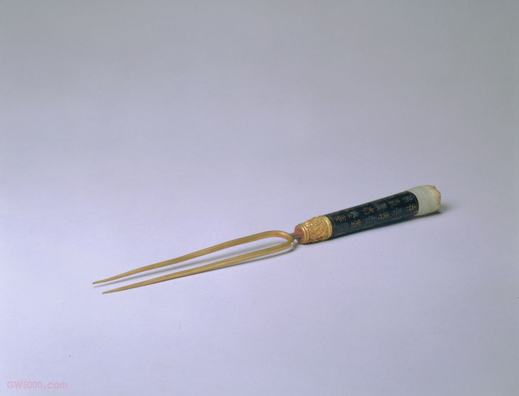 金嵌紫檀柄玉顶果叉,清,通长21.8厘米。 果叉金质。木柄安装处錾牡丹纹饰,镶有紫檀木柄。木柄上以金银丝嵌48个“寿”字,顶端镶嵌白玉雕花顶。 果叉为宫廷饮食器具之一,其装饰多在柄部,一般嵌有金、银、玉、木、牙、骨及珐琅等等,造型各异,种类繁多,工艺精湛。此件果叉之金镶玉的做法应源于等级制度的规定,说明此器是帝后重要典礼中的用品。其上装饰寿字,则可推断此叉是为某位皇帝或皇后过生日而特制的。紫檀木是世界上最名贵的木材之一,主要产于南北回归线之间的热带、亚热带地区,我国广东、云南等地有少量出产。其木质坚硬,体重,入水即沉,没有疤痕,呈紫黑色。紫檀木生长缓慢,非数百年不能成材,故极珍贵。紫檀木的纹理纤细浮动,变化无穷,其色调深沉,显得稳重、大方、美观。《博物要览》称:“新者色红,旧者色紫,有蟹爪纹,新者以水浸之,可染物。”我国古代使用紫檀木制作器物历史悠久,东汉末年已见于记载,唐代宫廷中亦有使用紫檀木的记载。至明代,紫檀木更是受到皇家的宠爱。清代,紫檀木大量进入宫廷中,为内务府造办处用于制作清宫家具及文玩之器的必备材料,同时一些富商大贾之家也多使用名贵的紫檀木制造家具及生活用品。 我国古代金工传统工艺之一。铸造铜器时,在需镶嵌部位表面铸成线槽,将松石、红铜片或金银丝、片嵌入凹槽,再打磨平滑。镶嵌工艺始于二里头文化时期,在春秋时期较盛行。 珐琅,又称“佛郎”“法蓝”“琺瑯”,是一外来语的音译词。珐琅的基本成分为石英、长石、硼砂和氟化物,与陶瓷釉、琉璃、玻璃(料)同属硅酸盐类物质。中国古代习惯将附着在陶或瓷胎表面的称“釉”;附着在建筑瓦件上的称“琉璃”;而附着在金属表面上的则称为“珐琅”。 金属胎珐琅器则依据在制作过程中具体加工工艺的不同,可分为掐丝珐琅器、錾胎珐琅器、画珐琅器和透明珐琅器等几个品种。
