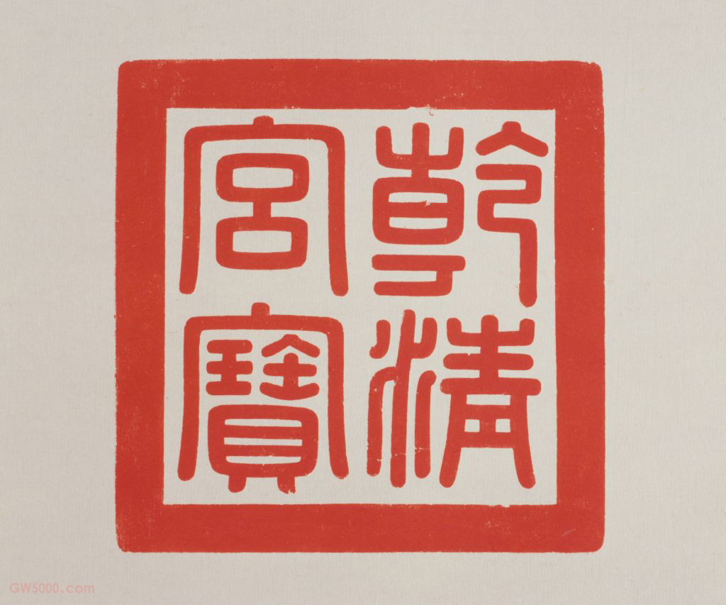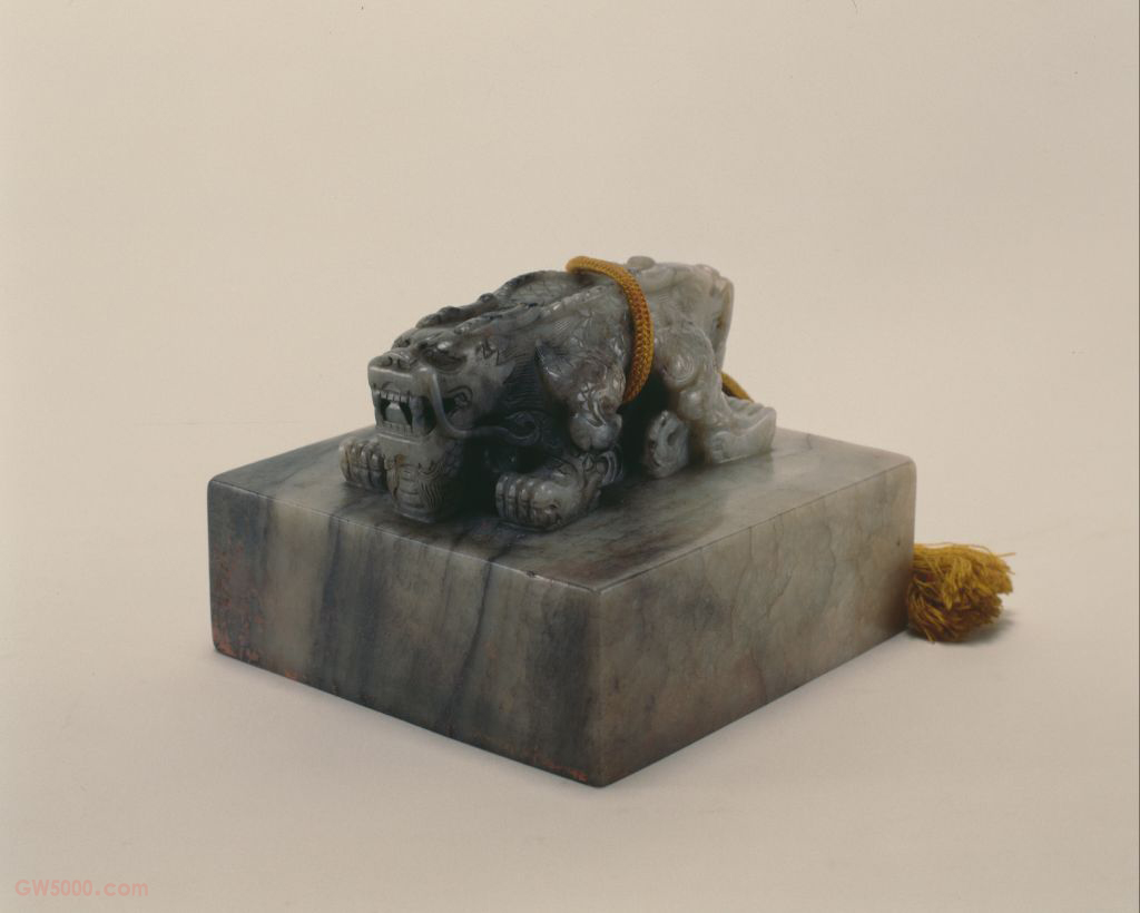“乾清宫宝”,清乾隆,青玉质,交龙纽方形玺,汉文篆书。面11.6厘米见方,通高8.5厘米,纽高4.4厘米。附系黄色绶带。 乾清宫为紫禁城内廷等级最高的建筑,始建于明永乐十八年(1420),明代是皇帝的寝宫和日常活动的场所,内部有暖阁九间,每间分上下两层,各有楼梯相通,皇帝可以随意居住。明朝震撼宫廷的宫女绳勒嘉靖帝的“壬寅宫变”以及晚明三大宫廷奇案中的“红丸案”和“移宫案”均发生在这里。清代顺治帝、康熙帝仍住于此,自雍正帝移居养心殿后,这里便成为皇帝读书、批阅奏章、召见大臣、引见官员以及举行内廷典礼和家宴之地。殿中“正大光明”匾为顺治帝御笔,雍正帝定秘密建储制,建储匣即高置于此匾之后。帝后宝印的纽制之一。其纽形为两条相向的龙躯体合二为一。