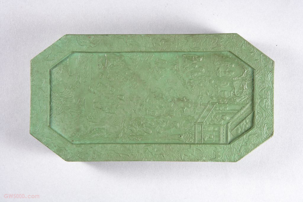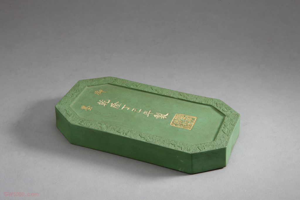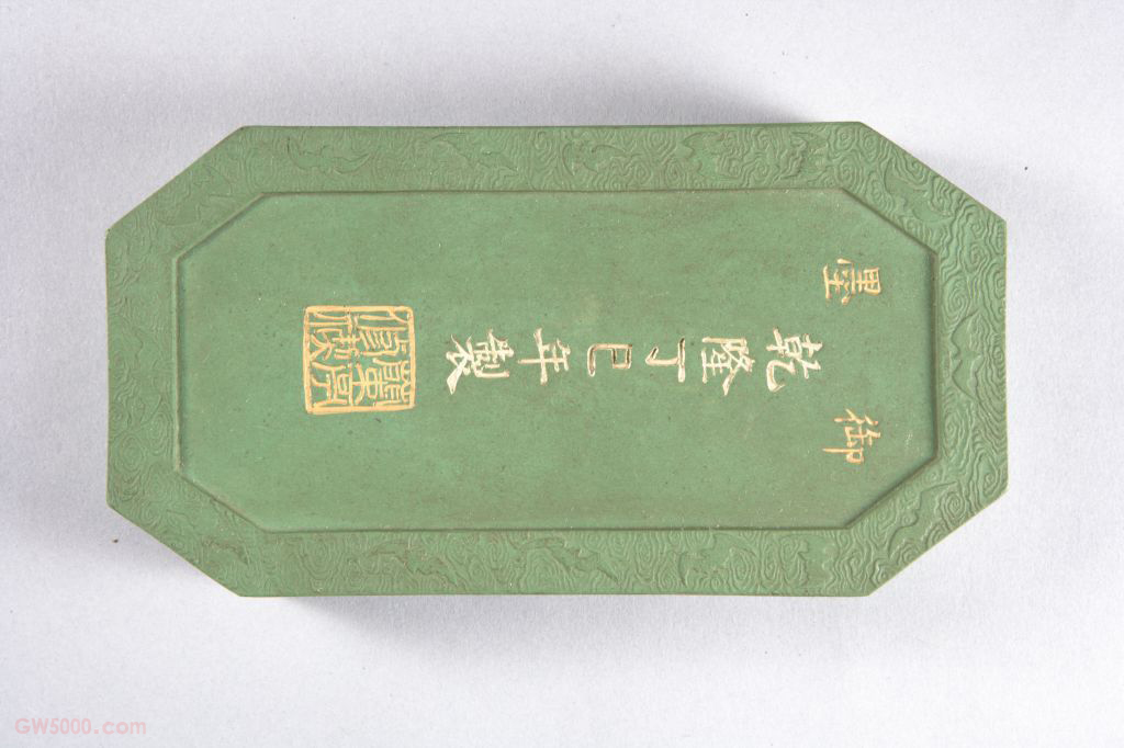 兰亭修禊绿御墨,清乾隆,长16.2厘米,宽8.4厘米,厚2.2厘米。 绿色。正面为“兰亭修禊”图。背面上方有楷书“御墨”两字,中间为楷书“乾隆丁巳年(1737年)制”六字,下方为“兰亭修禊”印一,皆填金。此墨一套共二十六锭。占卜日期。殷人记日用天干(甲乙丙丁戊己庚辛壬癸)与地支(子丑寅卯辰巳午未申酉戌亥)相配,从甲子到癸亥,六十干支一轮回。本版第二句卜辞省略了占卜日期。