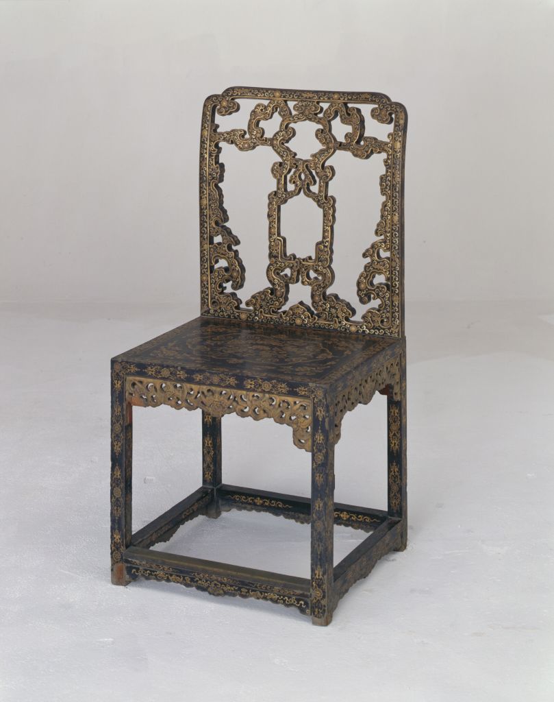 清,高103厘米,长51.5厘米,宽43.5厘米。 此椅又称一统碑式椅,因其后背长方而挺直,如同一块石碑,因而得名,为典型的清式椅。通体髹黑漆地,饰云蝠纹及花卉纹,以装饰富丽取胜。椅背透雕卷曲的云纹,座面两侧及前缘牙板都以透雕五蝠(福)云纹为饰,四面平底枨,枨下装牙条。 古建筑彩画绘画的一种题材。清代中期之前多画绿叶子花卉,清代晚期画黑叶子花卉。 雕刻技法之一。一种是在浮雕的基础上镂空背景部分,有单面雕、双面雕之分。另一种介于圆雕和浮雕之间,常用于民间床、窗、梁、护板的雕刻中。 家具部件名称。一般指面框或束腰下设置的连接于两腿之间的部件。设在其它部位的一般称为牙条。 五蝠,即五福。明朝刘三吾等奉敕撰《书传会选》卷四云:五福者,“一曰寿,二曰富,三曰康宁,四曰修好德,五曰考终命。”注云:“人有寿而后能享诸福,故寿先之,富者有廪禄也,康宁者无患难也,修好德者乐其道也,考终命者顺其正也。以王道言之,寿者尊贤养老也,富者利用厚生也,康宁者老安少怀也,修好德者任贤使能也,考终命者封谥如法送之以礼也,以福之急缓为先后。”五蝠捧寿为古代祝寿的常用题材。家具造型之一种,上下四面皆平直,故曰“四面平”。很多家具在立木与横木的支架交角处多运用形式不同的牙子来装饰。这种牙子中长而直的称为牙条。