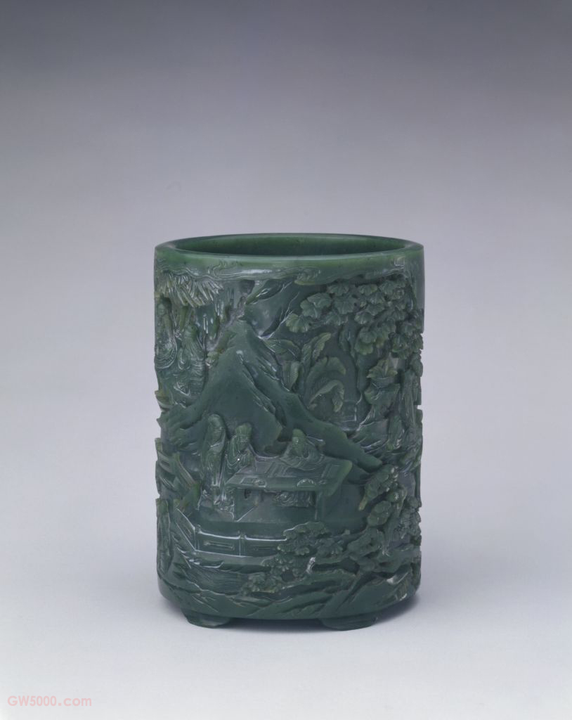 乾隆款碧玉西园雅集图笔筒,清,高15.6厘米,口径11.9厘米,底径12厘米。 笔筒为碧玉质。圆筒形,外壁通景雕刻西园雅集图案。上部雕大块的山石、竹林、花草、人物;下部雕小桥、流水、松树、栏杆、桌椅、人物等。图中共有10余老者或写字、作画,或交谈、观景,或在摩崖刻字等等。器底部出五矮足,等距,底部中心琢阴文隶书“乾隆年制”四字款。 西园雅集是中国古代画家喜爱表现的历史题材。西园是北宋驸马都尉王诜宅邸,当时的文人墨客常常雅集于此。王诜曾邀请苏轼、苏辙、黄庭坚、米芾、李公麟,以及日本籍的圆通大师等16人来游园。他们都是能文善画、博古通今、雄才绝俗的人物。两宋至明清的一些名画家都有相同题材的画作,流传至今。 碧玉是新疆和阗软玉中的一个品种,软玉主要有白玉、青玉、碧玉、墨玉、黄玉等品种。其中碧玉色如菠菜叶,略有透明感,呈油脂或蜡状光泽。由于所含成分不同,颜色和结构均不如其它软玉均一,色彩淡的呈菜色,色彩深的呈墨绿色,还有斑杂的大环斑状。 指文人雅士吟诗作画、议论学问以及休闲娱乐的集会。文房用具,插放毛笔之用。流行于明清两代,器形似筒状,另外也有方形、束腰形、竹节形等式样。常见有青花、釉里红、五彩、粉彩、斗彩等瓷器品种,也有铜胎、竹木牙角等质地的笔筒。篆刻的一种方式,即把印文镌成凹状,在纸上钤盖时印文是白色,因而又称为白文。 王诜(约1048—1104年前后),字晋卿,山西太原人。出身贵胄,娶宋英宗女,为驸马都尉。与苏轼等人交往密切,常相与酬唱,探讨艺术。工诗文,长于书画,尤擅山水,师法李成。<br /> 苏轼(1037—1101年),字子瞻,号东坡居士,眉山(今属四川)人。苏洵次子。北宋著名文学家、书法家、画家。仁宗嘉祐二年(1057年)进士。熙宁时任祠部员外郎,知密州、徐州、湖州。因对王安石所行新政有异见,上书神宗,遂被贬谪黄州。元祐间复起用,任翰林学士,出知杭州、颍州,官至礼部尚书。绍圣四年(1097年),党争又起,再谪惠州、儋州,后遇赦北返,病殁常州,追谥“文忠”。与父洵、弟辙合称“三苏”。 其文汪洋恣肆,明白畅达,为“唐宋八大家”之一。作诗清新雅健,风格独具。词开豪放一派,与辛弃疾并称苏辛。擅书法,得力于王僧虔、李邕、徐浩、颜真卿、杨凝式而自成家数。用笔丰腴跌宕,有天真烂漫之趣。与黄庭坚、米芾、蔡襄并称“宋四家”。工画竹,学文同,为湖州竹派之一。能作枯木、怪石、佛像,出笔奇古。论画力主“神似”,并提倡“士夫画”,强调诗画一律,为古代文人画先驱。传世书迹有《答谢民师论文帖》、《祭黄几道文》、《前赤壁赋》、《黄州寒食诗帖》等。传世绘画有《古木怪石图》卷、《枯木竹石图》卷(与文同《墨竹图》卷合装),现藏上海博物馆。著有《东坡七集》、《经进东坡文集事略》等。 黄庭坚(1045—1105年),字鲁直,号山谷道人,又号涪翁,洪州分宁(今江西修水)人。北宋治平四年(1067年)举进士,以校书郎为《神宗实录》检讨官,后擢升起居舍人、秘书丞、国史编修官。绍圣年间因章惇、蔡卞等党人论实录多诬,被贬为涪州别驾,安置黔州,此后多次被贬官在外,最后至宜州(今广西宜山),死于该地。他曾与张耒、晁补之、秦观俱学于苏轼门下,被称为“四学士”。他善为文章,长于写诗,尤以擅长书法著称,其楷体字势开张,笔力刚劲;草体盘曲迴旋,变化无方,被誉为北宋四大书家之一,著有《山谷集》行世。米芾(1051—1107年),字元章,号鹿门居士、襄阳漫士、海岳外史,祖籍山西太原,后迁襄阳(今湖北襄樊),晚定居润州(今江苏镇江)。曾任地方官,宋徽宗时任书学博士,擢礼部员外郎,人称“米南宫”。精书画,绘画擅长水墨山水,作泼墨云山,自云:“信笔作之,多烟云掩映,树石不取细意,似便已。”(米芾《画史》)创“米家山”。他善用墨法,董其昌评:“老米画难于浑厚,但用淡墨、浓墨、泼墨、积墨、焦墨,尽得之矣。”(《容台别集》)所创“米点山水”意过于形,极富笔墨情趣,使山水之格为之一变。 书法初宗二王、颜真卿,后博采众长,自成一家。用笔变化多端,有“八面出锋”之誉,结体欹侧多姿,具真率自然之趣,为宋代“尚意”书风的代表书家,与蔡襄、苏轼、黄庭坚并称“北宋四大家”。 李公麟(1049—1106年),字伯时,号龙眠居士,舒城(今属安徽省)人。北宋著名画家。神宗熙宁中进士,官至朝奉郎。好古博学,喜藏钟鼎古器及书画。擅画人物、佛道像,尤精鞍马,更以白描画法独步当世。