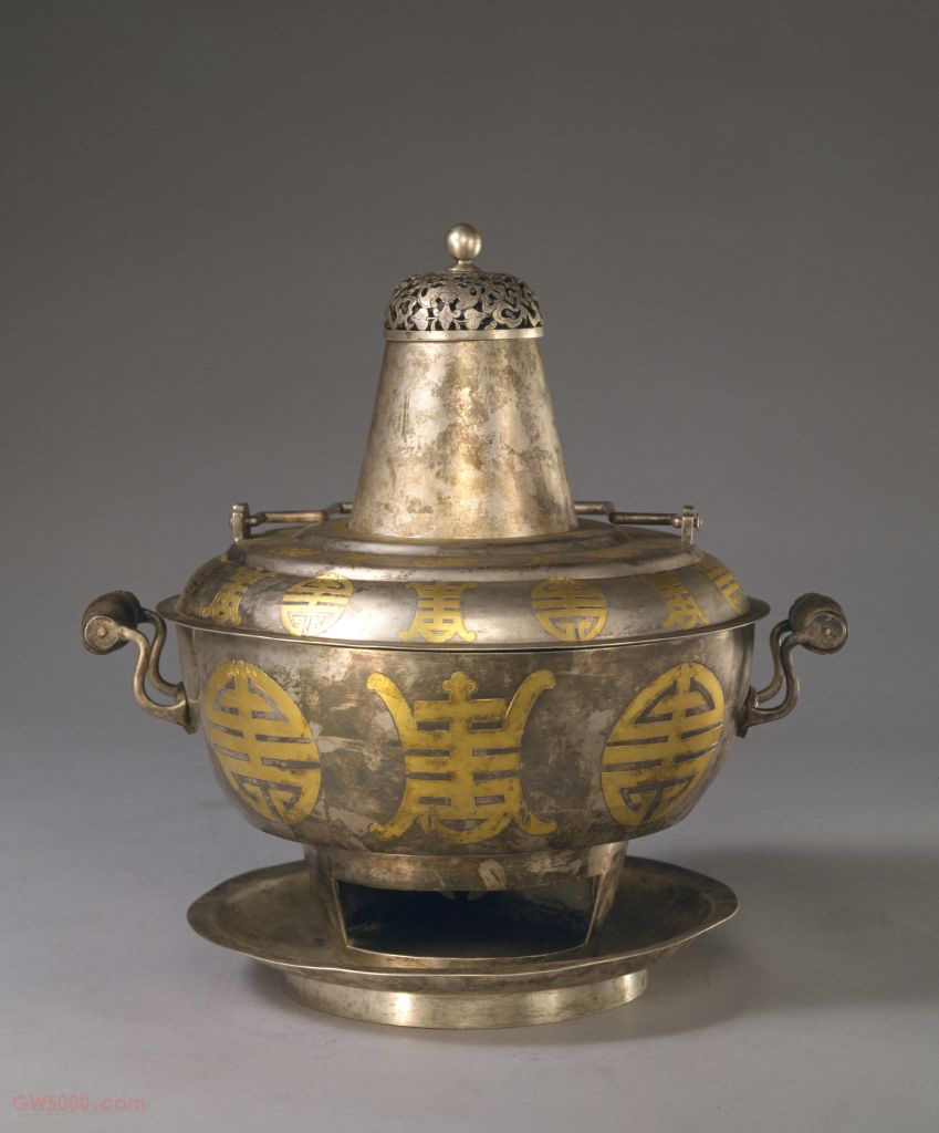 银寿字火锅,清光绪,高30厘米,直径32厘米。清宫旧藏。 火锅银质,由锅、盖、烟囱、闭火盖组成,锅内带炉,可用于烧炭。火锅的闭火盖上雕有镂空“卐”字纹,锅体满布金银圆“寿”字、长“寿”字、蝙蝠纹等,寓“福寿万年”之意。此锅用料讲究,做工精细,造型完美,为清代晚期慈禧太后经常使用的火锅。 火锅在清宫中又称热锅,其质地有陶瓷、纯银、银镀金、铜、锡、铁数种。其基本形式有两种:一种为组合式,由锅、炉支架、炉圈、炉盘、酒精碗5部分组成,可以同时上桌烧煮食物,也可单独用锅温食品。另一种为锅中带炉,炉内烧炭火,能把水烧开,生鱼、生肉、蔬菜等放入沸水中可以煮熟。此件火锅属于第二种类型。 镂空是瓷器的装饰技法之一,也被称作“镂花”或“透雕”。它是将器物胎体上的纹样镂通,形成内外通透的图案。