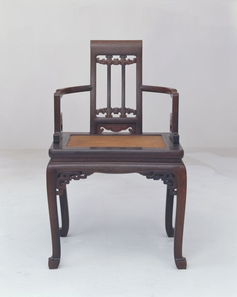 清,高91厘米,长54.5厘米,宽43.5厘米。 此椅栅栏式背板,背板过肩处凸起形成搭脑。板框中雕上下两组云纹,下接座面处有云纹亮脚。靠背两肩向前兜转,至扶手处下转,卷成回纹。藤心座面。鱼肚形牙板,两角有镂空拐子纹托角牙。四腿内收,外翻马蹄。 此椅整体虽为明式风格,但细部装饰已显露清式风格之端倪。装在椅背或衣架之上用于连接立柱和背板的构件。椅背搭脑一般正中稍高并略向后卷,以便人们休息时将头搭靠其上,故名。常指攒框式椅背的下牙,牙板下缘锼出各式镂空曲边,俗称“亮脚”。亦称欹床。中国传统家具中的一种坐具,现已很少见。其形式犹如椅子的靠背,是一种无座腿甚至无座面的坐具。其背后安有可以撑放的活动支架,可根据使用者的要求调节靠背的角度。它多在床榻上或席地使用。明高濂《遵生八笺》中说:“靠背以杂木为框,中穿细藤,如镜架然。高可二尺,阔一尺八寸,下作机扃,以准高低,置之榻上,坐起靠背,偃仰适情,甚可人意。”宋、明绘画中也可见到此种坐具。家具上常用的纹饰之一,由陶器和青铜器上的雷纹衍化而来,寓意吉利深长,苏州民间称之为“富贵不断头”。在家具上,回纹主要作为边饰,用于边框、牙条、足端或束腰等处。家具上大量采用回纹见于清代。家具部件名称。一般指面框或束腰下设置的连接于两腿之间的部件。设在其它部位的一般称为牙条。 镂空是瓷器的装饰技法之一,也被称作“镂花”或“透雕”。它是将器物胎体上的纹样镂通,形成内外通透的图案。 传统家具上的一种硬角连续拐弯的纹饰。如果加上龙头并与缠枝花卉相结合称“香草夔龙”,无龙头者则称为“拐子纹”。中国古代家具中横材与竖材相结合的直角下方所饰的牙子称为“托角牙”。横材与竖材相交的转角处装饰的花牙称角牙,横材在下称坐角牙,横材在上称倒挂牙子或“挂角牙”。明清家具的腿足装饰,足端向外翻的称“外翻马蹄”,向里翻称“内翻马蹄”。