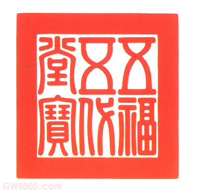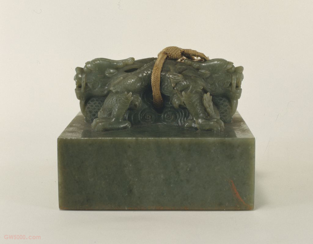 “五福五代堂宝”,清乾隆,青玉质,交龙纽方形玺,汉文篆书。面13厘米见方,通高9.8厘米,纽高4.9厘米。附系黄色绶带。 “五福五代堂”原为宫中景福宫内明间,乾隆四十九年(1784),乾隆帝喜得玄孙,一堂五世,故于乾隆五十二年(1787)亲书“五福五代堂”匾悬挂在景福宫内,并特作《五福五代堂记》:“兹蒙天貺,予得元孙,五代同堂,为今古希有之吉瑞。古之获此瑞者,或名其堂,以饷其事。则予之所名堂,正宜用此五福之名。”同时命镌刻多方“五福五代堂宝”玺以纪其事。不仅如此,乾隆帝又再书“五福五代堂”匾悬挂于避暑山庄东宫“卷阿胜境”殿内,并镌“避暑山庄五福五代堂宝”。所有这些,都是对他“古稀有七,曾元绕膝”这一人生重大历史的记录。景福宫堂内所悬乾隆御笔匾。乾隆四十九年(1784年)因得玄孙,一堂五世,而书此匾悬于景福宫内。此后复书“五福五代堂”悬于避暑山庄勤政殿之后殿。帝后宝印的纽制之一。其纽形为两条相向的龙躯体合二为一。 古建筑术语。指建筑各面正中四根檐柱之内的空间,其两侧称为次间。又称“承德离宫”、“热河行宫”,是清代著名的皇家园林,位于今河北省承德市。始建于清代康熙四十二年(1703年),五十年正式命名为避暑山庄。乾隆朝曾进行过大规模的扩建,是我国现存规模最大的清代皇家园林。康熙皇帝玄烨和乾隆皇帝弘历,每年夏、秋季至此居住,处理政务等,使之成为都城北京以外的又一个政治活动中心。