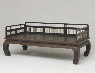 清,高88厘米,长210厘米,宽105厘米。 罗汉床硬板床面,三面床围攒框镶成。三面床围下部镶玉制竖棂,上部镶圆环卡子花间、方形大理石。其鼓腿膨牙,大挖马蹄兜转有力。 此床整体造型为明式风格,惟前端大牙条上雕拐子纹,其意趣较明代为晚,应系清代早期制品。梵文Arhat的音译阿罗汉之简称。又译为“应真”,或又称“尊者”,是释迦牟尼的弟子,小乘教修行的最高果位。罗汉受佛之嘱,常住世间,守护佛法,“得一切世间诸天人供养”。 罗汉像最初是依照佛教经典所造,侍立在释迦两侧的比丘(和尚)像,即阿难、迦叶。后又创造出十六、十八和五百罗汉像,有木雕、泥塑、石刻,以及铜和铁的金属铸造,也见于绘画和织绣。 南朝梁天监时画家张僧繇曾画十六罗汉,见《宣和画谱》。自唐初玄奘译出《法住记》,十六和十八罗汉像逐渐盛行。传唐代卢楞伽画有十六应真,五代贯休和张玄都曾画十八罗汉像。杭州烟霞洞五代时有十六罗汉像,经宋人添加了神僧和布袋和尚(俗称大肚弥勒)。寺庙中也盛行十八罗汉像的供奉。家具中床面或凳面之板心用木板镶成或席面下衬木板均称硬板。中国古代家具上用攒边方法做成的框称为攒框。镶在两根横木中间的雕有各种纹饰的构件。 苏式彩画中的基本图形之一。位于箍头与包袱之间,靠近箍头,偶见于檩枋中部。由如意图案演变而来,多以卷草纹方式组合,图形多变,如“万”字卡子、“寿”字卡子、夔龙卡子等。各种卡子均可分为硬卡子与软卡子式样,线条直硬者称硬卡子,柔曲者称软卡子。带束腰家具中常见的一种装饰手法。四腿自束腰下向外鼓出,然后又向内兜转,形成内翻马蹄状,牙板亦随腿的弧度向外膨出。 很多家具在立木与横木的支架交角处多运用形式不同的牙子来装饰。这种牙子中长而直的称为牙条。传统家具上的一种硬角连续拐弯的纹饰。如果加上龙头并与缠枝花卉相结合称“香草夔龙”,无龙头者则称为“拐子纹”。
