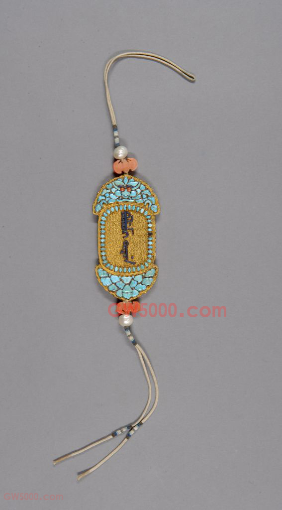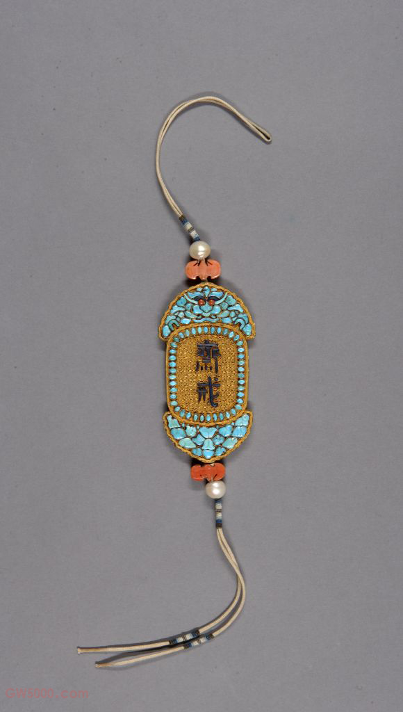 斋戒牌长圆形,边缘为累丝卷云纹,中部累丝四朵梅花,一面嵌青金石“斋戒”二字,一面为满文。上下嵌松石,上为兽面纹,红珊瑚为眼,青金石为眉。以丝绳、珍珠、红珊瑚蝙蝠穿系。
