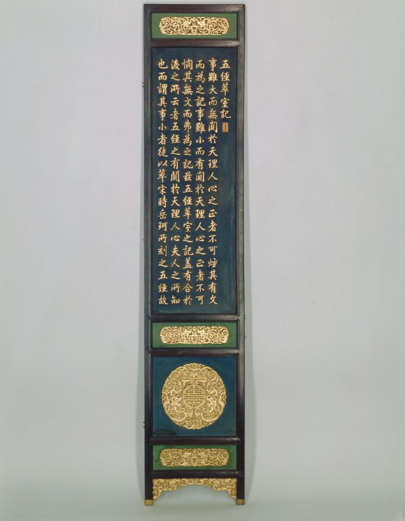 清嘉庆,单扇高188厘米,宽38厘米,通宽约230厘米,计6扇 。 此围屏以紫檀木作框,屏心双面髹漆。五条横抹,裙板正中镶圆浮雕双螭拱寿纹。裙板上下和壸门式牙条上分别浮雕双螭拱寿纹和双螭纹。屏心为清乾隆帝御制《五经萃室记》全文。图文用金丝楠木锼刻,表面髹金。全文地子部分采用呈磁青色的青金石碎屑、绿松石粉末。屏风整体装饰庄重典雅,图文丰满,别具一格。 御制文: “事虽大而无关于天理人心之正者不可炫其有文而为之记事虽小而有关于天理人心之正者不可憪其无文而弗为之记兹五经萃室之记盖有合于后之所云者五经之有关于天理人心夫人之所知也而谓其事小者徒以萃宋时岳珂所刻之五经故曰小然而六百岁之间分之复合散之仍聚则其事亦不谓小而况阐数大圣人之精徽示天理正人心斯可憪其无文而弗为之记耶岳珂所刻之五经奈何盖自乾隆甲子时荟萃宋元明三代旧板藏之昭仁殿名曰天禄琳琅其时即有岳氏所刻之春秋未详其所由来亦不过典别部春秋一例载之天禄琳琅之书而已兹复得岳氏所刻易书诗礼记四种而独阙春秋因思天禄琳琅中或有其书细检之则岳氏所刻之春秋故在其板之延袤分寸无不吻合而每卷之后皆有木刻亚形相台岳氏刻梓荆渓家塾即大小篆文楷书不等且每页之末傍刻篇识如易礼乾坤卦书之尧舜典之类其用心精而纪类审即宋板之最佳者亦不多见也。至于收藏家则易书诗盖同经七八家而略有异藏礼记者四家藏春秋者三家夫岳氏之书既分而合幸合则不可使复分但天禄琳琅之书久成所录诸书皆以四库分类架贮昭仁殿其丙申以后所获之书别弃于御花园之养性斋以待续入兹撤出昭仁殿之春秋以还岳氏五经之旧仍即殿之后庑所谓慎俭德室者分其一楹名之曰五经萃室都置一几是旧者固不出昭仁殿而新者亦弗栏入旧书中似此位置可谓得宜吾因思之位置一切政务亦能如是胥得宜乎所谓得宜者亦有人于天理人心之正而不违五经之旨乎刻书家多矣若兹分而复合者盖少遂命选善书者如影宋钞之例通锓其五经正本以寿世而公来者吾于是慨武穆之忠而喜其有文孙承继家声也又恨宋高宗之信奸相忌复雠而自坏其长城也又谓天之报施善人固不爽而司马迁怨尤之语诚不足为信史也乾隆癸卯新正月中翰御笔” 文中叙述了宋代岳珂所刻之五经散聚之经历和“五经萃室”的由来。 此围屏原为乾清宫东侧昭仁殿内后西室所陈之物,嘉庆年间干清宫失火,殃及昭仁殿,殿内的岳刻五经连同《五经萃室记》围屏全部被焚毁。如今的五经及《五经萃室记》围屏均为嘉庆时火灾后按原样复制的。紫檀木是世界上最名贵的木材之一,主要产于南北回归线之间的热带、亚热带地区,我国广东、云南等地有少量出产。其木质坚硬,体重,入水即沉,没有疤痕,呈紫黑色。紫檀木生长缓慢,非数百年不能成材,故极珍贵。紫檀木的纹理纤细浮动,变化无穷,其色调深沉,显得稳重、大方、美观。《博物要览》称:“新者色红,旧者色紫,有蟹爪纹,新者以水浸之,可染物。”我国古代使用紫檀木制作器物历史悠久,东汉末年已见于记载,唐代宫廷中亦有使用紫檀木的记载。至明代,紫檀木更是受到皇家的宠爱。清代,紫檀木大量进入宫廷中,为内务府造办处用于制作清宫家具及文玩之器的必备材料,同时一些富商大贾之家也多使用名贵的紫檀木制造家具及生活用品。 在平面上雕出凸起的纹饰或物象的一种雕塑。按凸起高度的不同,可分为高浮雕、深浮雕、浅浮雕等,也有几种雕刻技法结合使用的形式,多见于高精繁杂的雕刻作品。 宫内小巷道称壸(音捆),此处为家具术语之一。通常在横牙正中开一尖口,再向两侧曲线延伸与竖向牙条相交,此种作法称为劵口;如果牙条四面相交,则每面正中均开尖口,此种作法称为圈口;如果只有一面横牙条作出壸门装饰,则称为壸门牙子。很多家具在立木与横木的支架交角处多运用形式不同的牙子来装饰。这种牙子中长而直的称为牙条。螭,传说中的一种龙,又名螭虎龙。明式家具常用为装饰纹样。汉武帝于建元五年(公元前140 年)开始在朝廷设五经博士之官,以备咨询。当时的五经是指《易》、《书》、《诗》、《礼》、《春秋》。此时的《礼》指《仪礼》,后世改为《礼记》,《春秋》又合以《左传》。皆先秦儒家之经典,但均掺有汉儒推想成分。再经历代儒家注解发挥,都成为有利于封建统治的理论。其讲史的内容,多出自《通鉴纲目》、《贞观政要》及本朝的《皇明祖训》等史籍。 楠木产自我国四川、云南、广西、湖北、湖南等地,为常绿乔木,高十余丈,叶为长椭圆形。传说这种木材水不能浸,蚁不能穴,南方人多用作棺木或牌匾。楠木美观,但不如硬木华丽。 所谓地子是指青铜器长期埋藏地下,受多种腐蚀因素影响,在器物表面生成的一层不同色泽的致密的腐蚀光膜,是鉴别古代青铜器的重要标志之一。常见地子有黑漆古、绿漆古、鸡骨白、反铜地、水银浸地等。 屏风是我国古代室内的主要陈设器物。其最早的功能为挡风和遮避用。据《三礼图》记载:“屏风之名出于汉世,故班固之书多言其物。”以后随着工艺的进步,屏风逐渐由原来的实用品演进为实用性和装饰性结合的工艺品,成为古人居室内具有观赏性的陈设家具。屏风在清代发展尤盛,无论是所用材料还是工艺技术都达到了历史最高水平。 指夏、商、周三个朝代。岳氏(1183—1234