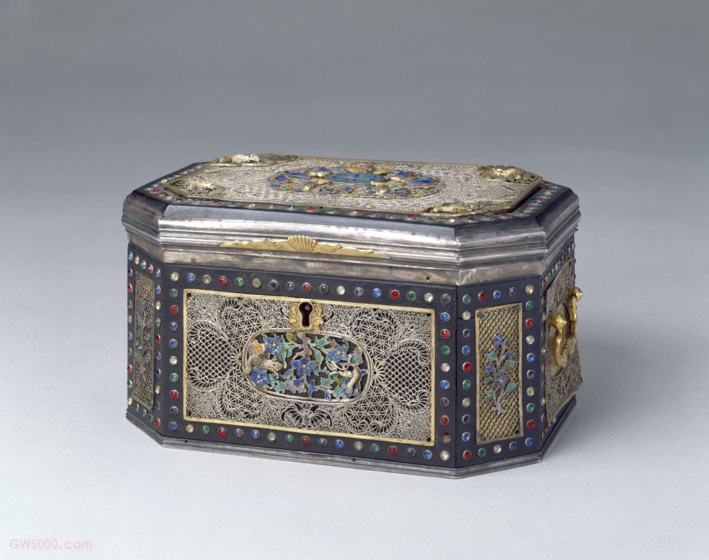 此盒作工精细,富丽堂皇,当为后妃盛首饰之用。 我国古代金工传统工艺之一,又名“花作”或“花纹”,为金属工艺中最精巧者。它是将金银拉成丝,然后将其编成辫股或各种网状组织,再焊接于器物之上,谓之累丝。立体的累丝作品制作最难,须事先经“堆灰”的手续。所谓“堆灰”,即把炭研成细末,用白芨草泡制的粘液调和作为塑料,塑成人物或走兽等所要制作的物象,然后再在上面进行累丝,用焊药焊连,之后置于火中把里面的炭模烧毁,即成立体中空剔透玲珑的精美艺术品。 珐琅制作工序之一。即将点蓝后的器物放入炉中,以500—900℃左右的火焰焙烧。这两道工艺一般需反复三四次。