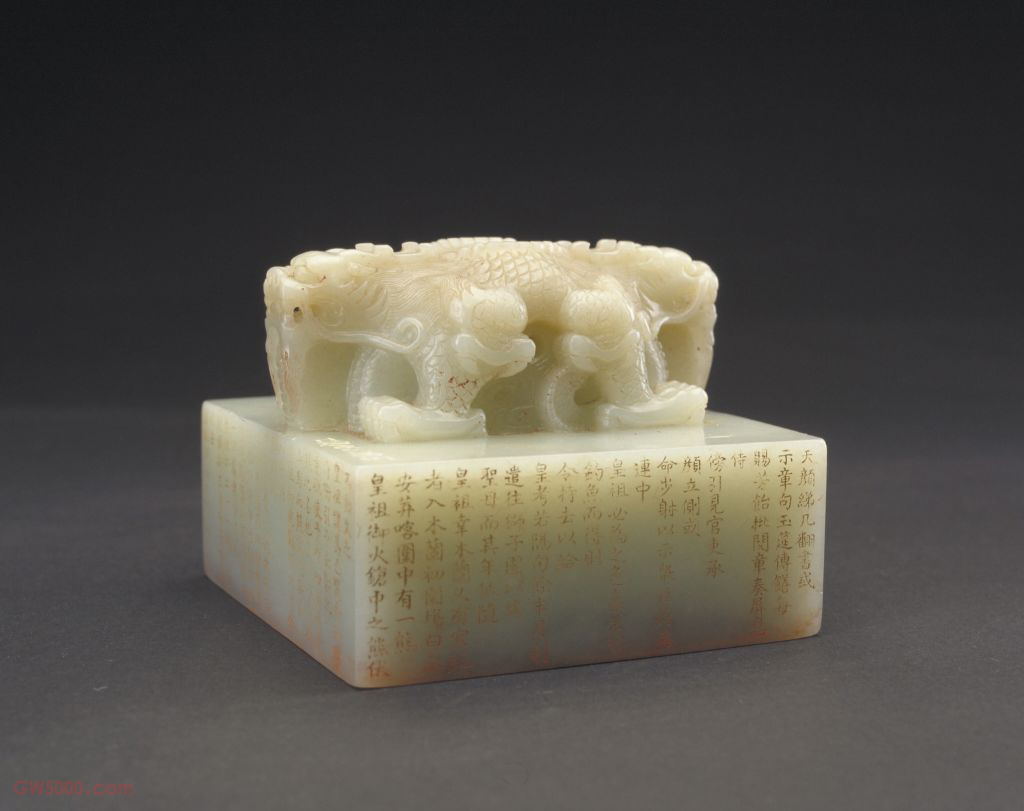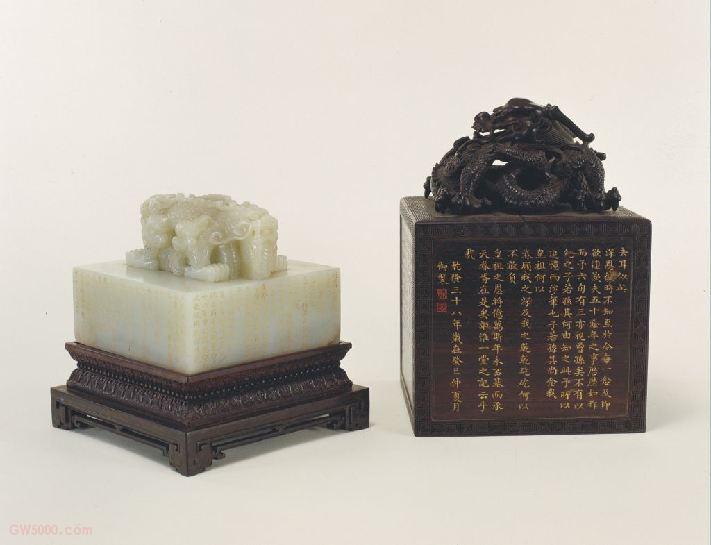 “纪恩堂”宝,清乾隆,青玉质,交龙纽方形玺,汉文篆书。面11.9厘米见方,长6.5厘米,通高9.4厘米,纽高4.5厘米。 此玺质地温润,雕刻精细。印台四周浅刻填金乾隆御制《避暑山庄纪恩堂记》,配紫檀木雕龙宝匣,匣四周亦阴刻填金同一篇御制文,落款为“乾隆三十八年岁在癸巳仲夏月御制”,可知此玺制作是在1773年。按:纪恩堂共有两处,一处在避暑山庄,一处在圆明园,是乾隆帝为纪念祖父康熙帝将其养育宫中的深恩而特意命名的。乾隆帝在《避暑山庄纪恩堂记》中讲道:“圆明园之纪恩堂,纪受恩之自。避暑山庄之纪恩堂,纪受恩之迹。名同而实异,文异而事同。”所谓受恩之迹,即指乾隆帝十二岁时曾随康熙来到避暑山庄,康熙安排他在万壑松风之侧室居住、读书,令其日夜陪侍左右,对他呵护备至。乾隆帝即位后特书“纪恩堂”匾悬于此殿。从此玺四周所刻御制文,可知此玺是专门为避暑山庄内的纪恩堂制作的,平时放在其中,以备钤用、纪念。帝后宝印的纽制之一。其纽形为两条相向的龙躯体合二为一。 又称“承德离宫”、“热河行宫”,是清代著名的皇家园林,位于今河北省承德市。始建于清代康熙四十二年(1703年),五十年正式命名为避暑山庄。乾隆朝曾进行过大规模的扩建,是我国现存规模最大的清代皇家园林。康熙皇帝玄烨和乾隆皇帝弘历,每年夏、秋季至此居住,处理政务等,使之成为都城北京以外的又一个政治活动中心。 紫檀木是世界上最名贵的木材之一,主要产于南北回归线之间的热带、亚热带地区,我国广东、云南等地有少量出产。其木质坚硬,体重,入水即沉,没有疤痕,呈紫黑色。紫檀木生长缓慢,非数百年不能成材,故极珍贵。紫檀木的纹理纤细浮动,变化无穷,其色调深沉,显得稳重、大方、美观。《博物要览》称:“新者色红,旧者色紫,有蟹爪纹,新者以水浸之,可染物。”我国古代使用紫檀木制作器物历史悠久,东汉末年已见于记载,唐代宫廷中亦有使用紫檀木的记载。至明代,紫檀木更是受到皇家的宠爱。清代,紫檀木大量进入宫廷中,为内务府造办处用于制作清宫家具及文玩之器的必备材料,同时一些富商大贾之家也多使用名贵的紫檀木制造家具及生活用品。 阴刻:将图像、文字以凹陷形式雕刻。圆明园位于北京市海淀区东部,占地约350万平方米,由圆明、长春、万春三园组成。始建于康熙四十八年(1709年),雍正、乾隆年间陆续扩建,至乾隆三十五年(1770年)基本建成。嘉庆、道光、咸丰时有所增建,前后历时150余年,终于建成了一个包括140余所宫殿楼阁、100多处秀丽景致的宏伟的皇家园林。咸丰十年(1860年)第二次鸦片战争中被英法联军焚毁。此景点是据五代——北宋画家巨然的《万壑松风图》进行设计的。景名承袭了画名。