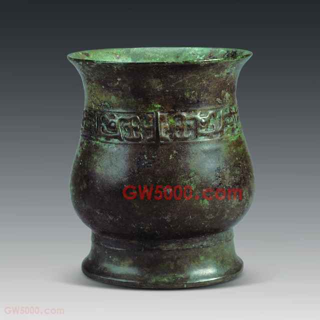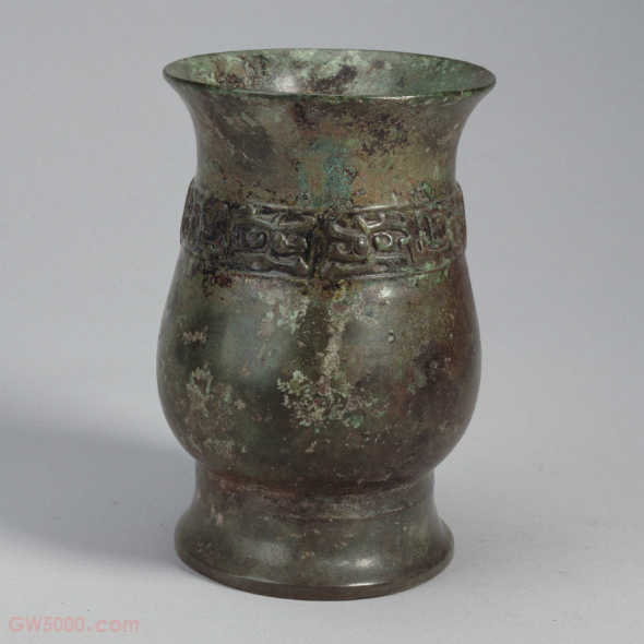 侈口、束颈、鼓腹,圈足外撇成矮阶。颈部周饰顾首鸟首龙身纹,圈足饰一圈弦纹,余为素面。