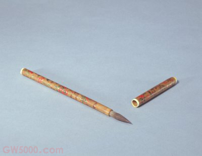檀香木彩画福寿笔,管长 26厘米,直径1厘米。 此笔管、帽均采用名贵的檀香木制作,纤直细腻,散发淡淡的幽香,上以金彩绘寿桃、灵芝、蝙蝠、万年竹等吉祥纹样,并饰以朱、绿、绛等色彩。管、帽两端嵌饰象牙。笔头紫毫制,根部较细,色浅,至腰部凸隆,色渐深,呈兰蕊式,此形是紫毫的天然特征所致。 该笔选材名贵,制作精工,是清宫中最具观赏和使用价值的毛笔之一。 蕈的一种。食用灵芝,有强筋骨、益精气的滋补作用。灵芝在中国古代民间信仰中具有吉祥长寿的寓意。灵芝的出现,预兆着国泰民安,世事昌达,所谓“圣人休祥,有五色神芝含秀而吐荣”(《神农本草》)。《瑞应图》也称:“芝英者,王者德仁而生。”灵芝图案多出现于各种材质的古代艺术品和建筑彩画中。为野兔脊背上一小撮紫黑色弹性极强的箭毛,也称箭毫。紫毫比普通兔毛坚长健利,稀少而名贵。唐诗人白居易《紫毫笔》诗称:“宣州之人采为笔,千万毫中拣一毫。每年宣城进笔时,紫毫之价如金贵。”