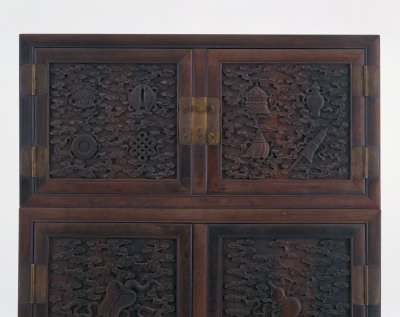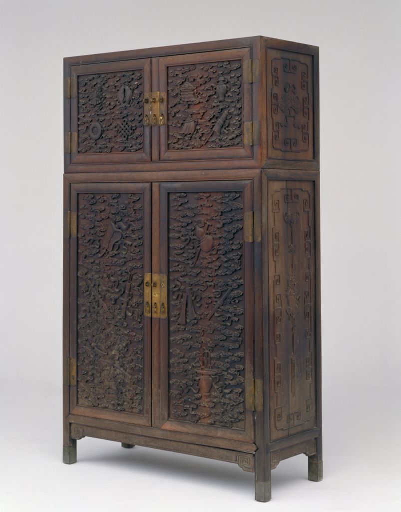 清,高172厘米,横102.5厘米,纵41厘米。 顶箱立柜紫檀质,柜门采用落膛踩鼓式,正面打槽装板。顶柜门心板雕云纹为地,上雕八宝纹;立柜门心板亦以云纹为地,上雕暗八仙。柜的两侧面山板雕锦结蝠磬葫芦纹。柜正面边框安铜錾螭纹镀金活页及面页。 此柜系由清宫造办处制作。这里制作的家具精雕细琢,小处亦不随便,从柜上的铜活即可见一斑。此柜云纹之间平整如一,铲地尤见匠师之功力。用开槽口的方法嵌装板片,称为“打槽装板”。佛前供器,藏文称之为“八吉祥相”。由法轮、法螺、宝伞、白盖、莲花、宝罐、金鱼、盘肠八件组成。每件供器含义不同:轮代表佛说大法圆转,万劫不息;螺代表菩萨果妙音吉祥;伞代表张弛自如,曲覆众生;盖代表遍覆三千,净一切乐;花代表出五浊世无所染;罐代表福智圆满,具完无漏;鱼代表坚固活泼,能解坏劫;肠代表回环贯彻,一切通明。因为八宝寓意吉祥,所以成为我国传统工艺中的主要纹饰。 中国传统装饰纹样之一。八仙指神话传说中神通广大的道家神仙铁拐李、汉钟离、蓝采和、张果老、何仙姑、吕洞宾、韩湘子和曹国舅,他们各持一件宝物,分别是葫芦、扇子、花篮、渔鼓、荷花、宝剑、洞箫和玉板,传说这些宝物法力无边,有逢凶化吉之作用,其被用作装饰图案,以物代人,称暗八仙。 “八仙”乃古代神话传说中的8位神仙:铁拐李、汉钟离、蓝采和、张果老、何仙姑、吕洞宾、韩湘子与曹国舅。 螭,传说中的一种龙,又名螭虎龙。明式家具常用为装饰纹样。