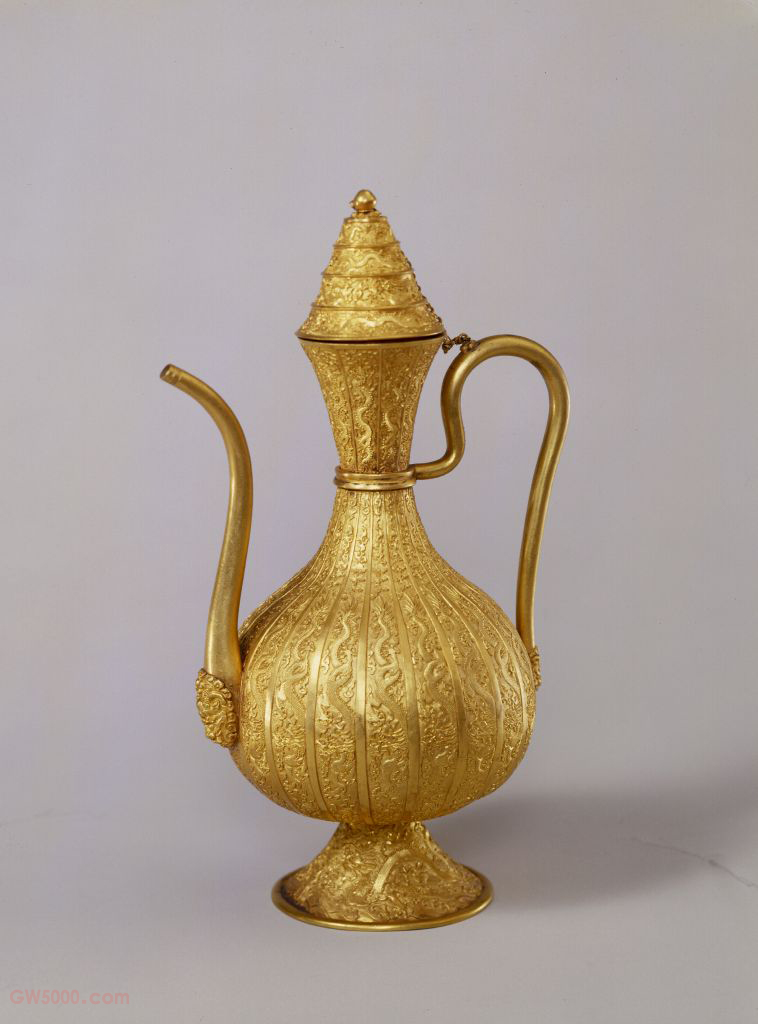 执壶八成金质。束颈,鼓腹,通体錾刻龙戏火珠纹,颈部为10条龙,腹部为20条龙,颈、腹之间以两道玄纹间隔。弯弧形兽吞式长柄及长流,柄端与盖顶之间有金链相连。盖呈四层圆形尖塔状,每层均饰双龙戏珠纹,共8条龙。底足为外撇形高圈足,其上饰有龙戏珠纹和海水江崖纹。