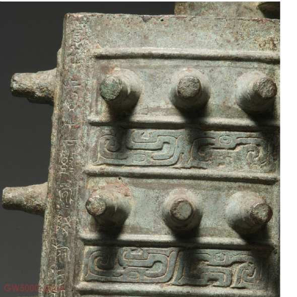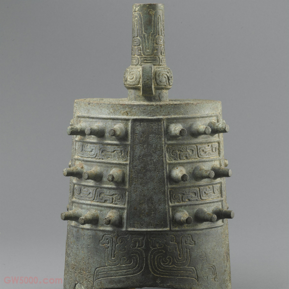 旅钟出土时为七件,此为第四钟。体呈合瓦形,甬部饰波曲纹和重环纹,篆间饰窃曲纹,鼓部饰相背卷龙纹、右侧有一凤鸟纹。