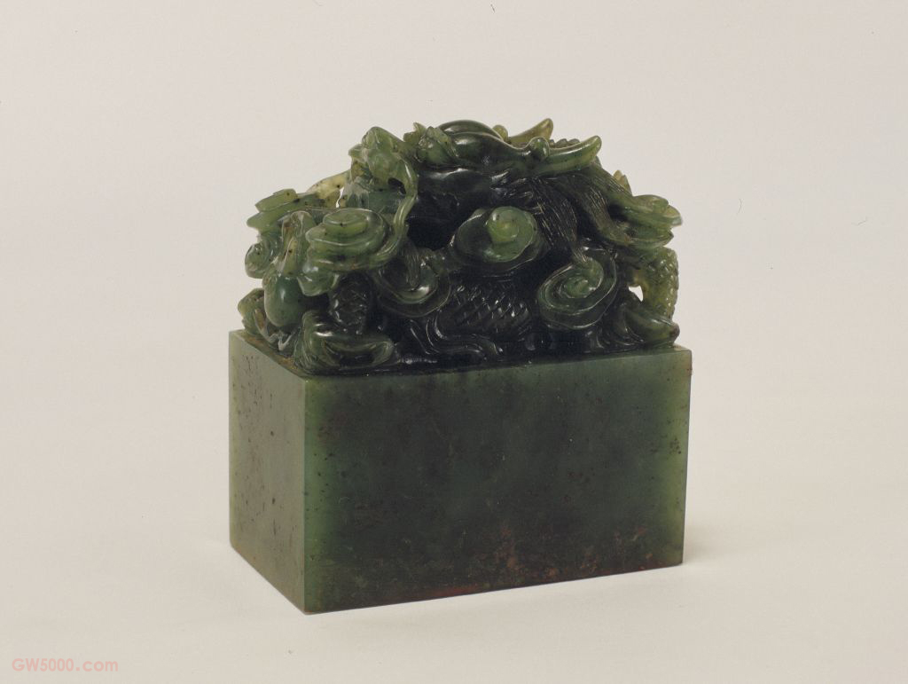 “四知书屋”印,清乾隆,碧玉质,交龙纽长方形玺,汉文篆书。面宽3.5厘米,长6.5厘米,通高7厘米,纽高3.4厘米。 四知书屋位于避暑山庄淡泊敬诚殿之后,是召见王公大臣之所。康熙帝曾题“依清旷”匾悬于内檐,乾隆时又题“四知书屋”匾悬于外檐。关于“四知书屋”的含义,乾隆帝在其《四知书屋记》中有详尽的解释:“予之所谓四知者,盖引孔子《系辞》知微、知彰,知柔、知刚之意,内以正心,外以敕政,而更慎于用兵之际。……盖微,柔阴也;彰,刚阳也。阳动而阴静,动无不由静,彰无不由微,刚无不由柔。然而柔能制刚,微能揜彰,静能胜动,此又圣人扶阳抑阴之本义。正心敕政,以及用兵者,不可不深知。”以此作为修身养性、熙政诘戎之大法。 碧玉是新疆和阗软玉中的一个品种,软玉主要有白玉、青玉、碧玉、墨玉、黄玉等品种。其中碧玉色如菠菜叶,略有透明感,呈油脂或蜡状光泽。由于所含成分不同,颜色和结构均不如其它软玉均一,色彩淡的呈菜色,色彩深的呈墨绿色,还有斑杂的大环斑状。 帝后宝印的纽制之一。其纽形为两条相向的龙躯体合二为一。 又称“承德离宫”、“热河行宫”,是清代著名的皇家园林,位于今河北省承德市。始建于清代康熙四十二年(1703年),五十年正式命名为避暑山庄。乾隆朝曾进行过大规模的扩建,是我国现存规模最大的清代皇家园林。康熙皇帝玄烨和乾隆皇帝弘历,每年夏、秋季至此居住,处理政务等,使之成为都城北京以外的又一个政治活动中心。 孔子(公元前551年—前479年),名丘,字仲尼。春秋鲁国人,儒家之祖。初仕于鲁,为司寇,摄行相事,其后不用,遂周游四方。归鲁,删诗书,定礼乐,赞周易,修《春秋》。有弟子3000人,身通六艺者72人。