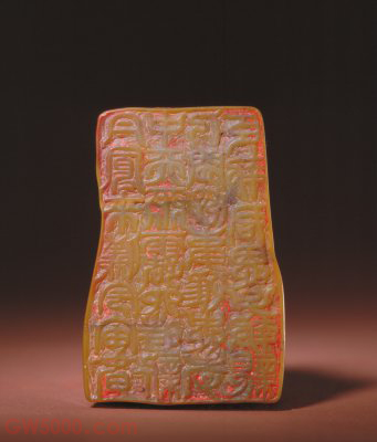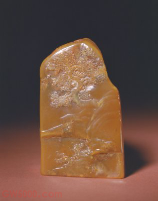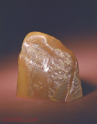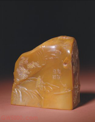 田黄石浅浮雕“秋江待渡”章,清中期,长6.1厘米,宽4.1厘米,通高6.5厘米,重235g。 印田黄石制,随形,薄意,侧款。印文篆体,朱文,右上起顺读“丹凤来仪宇宙春,中天雨露四时新,人间好事惟忠孝,臣报君恩子报亲”七言诗一首。题款阳刻篆书体“秋江待渡”。 由于田黄石珍贵难得,故在章料的雕饰上往往用其原形,尽量避免石材的损耗,根据石材进行“巧雕”,巧妙地运用田黄石与外层皮色,使图案层次明晰。此件“秋江待渡”的石章,一侧为一老者拄杖待舟于岸,随身小童招手呼舟,梢公撑一叶扁舟前来,岸上秋木萧萧,天空中寒鸦归林,一派秋韵野渡的意境。另一侧表现一长者头戴毡笠,拥裘,策蹇而行,一童子担箧随趋于后,路旁树木凋零,秋意已浓,雕工与构图颇具巧思。而宣扬忠孝之道的印文在立意和刻艺上都不甚佳,与此方珍贵的石章实不匹配。田黄石产于我国福建省福州市北寿山乡水田之下。石大者如卵,呈自然形态,色黄者称之为田黄,有黄金黄、桔皮黄、枇杷黄等多种。清初以来,取以治印,因其难得,遂成为印材中的珍品,故有“一两田黄一两金”之说。在平面上雕出凸起的纹饰或物象的一种雕塑。按凸起高度的不同,可分为高浮雕、深浮雕、浅浮雕等,也有几种雕刻技法结合使用的形式,多见于高精繁杂的雕刻作品。 即浅浮雕艺术。 雕镂之工。