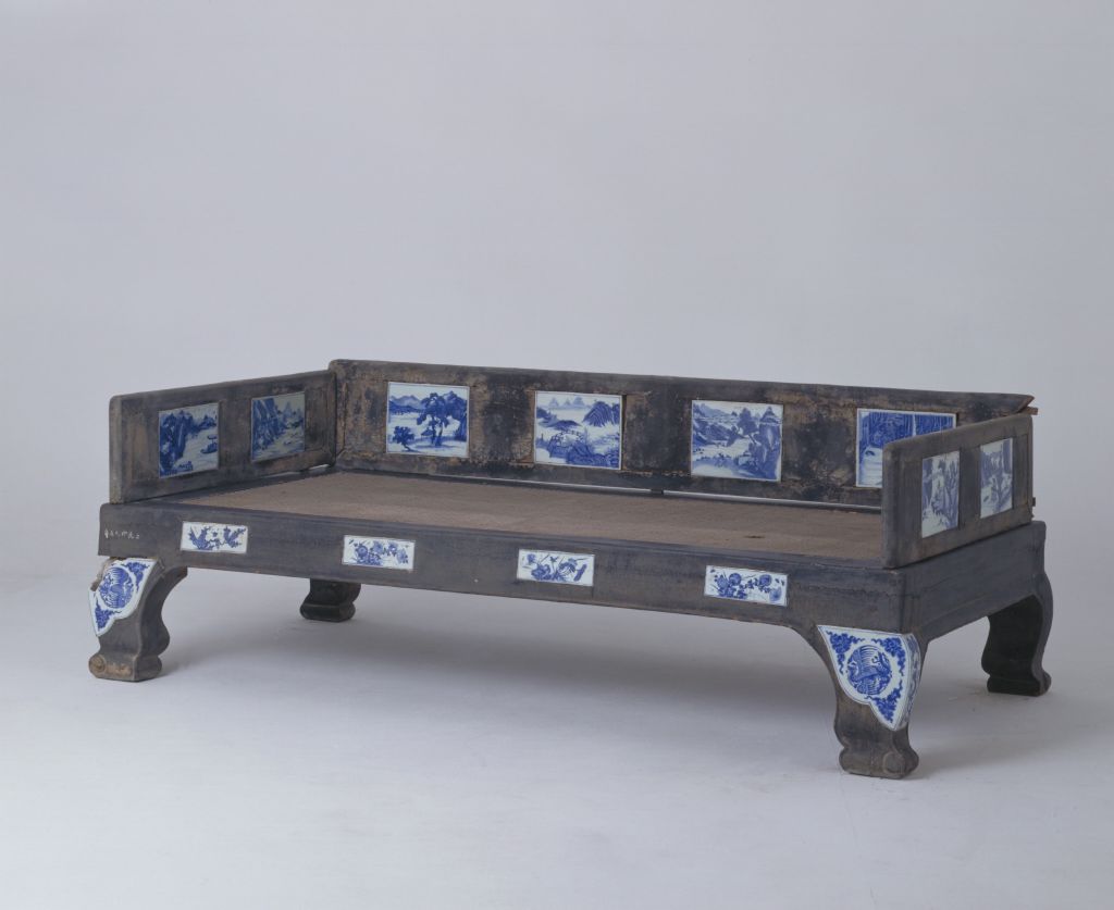清初期,高76厘米,长216厘米,宽107厘米。 床身通体以黑漆为地,藤心床面,床沿正面嵌春夏秋冬四季花卉青花瓷板,两腿嵌团凤及祥云纹。床面之上装床围,共嵌青花瓷板八块,瓷板与床围厚度相同,两面均装饰山水风景图。据瓷器专家鉴定,瓷片为清代康熙时期的制品。 古建筑彩画绘画的一种题材。清代中期之前多画绿叶子花卉,清代晚期画黑叶子花卉。瓷器釉彩之一,被用作白地蓝花瓷的专称。因蓝花在釉下,所以青花属釉下彩。其原料为含氧化钴的钴土矿,以蓝青色料在瓷胎上描绘纹饰,然后施透明釉,在高温还原焰中一次烧成。元代景德镇已能烧制成熟的青花瓷器。青花瓷器的盛行改变了青瓷为主的局面,成为明、清两代中国瓷器生产的主流。 唐人对黑色釉地上饰以天蓝或月白等色花斑的瓷器的称谓。唐代工匠为了改变黑釉瓷器的单调色彩,创造性地在黑色的铁质底釉上施加以铜、锰、钛、磷酸钙等为原料的釉料,经高温烧制,釉料相互融合、浸润,变化出黑蓝、天蓝、褐色、月白等彩色斑纹,深受人们的喜爱。其产地主要有河南鲁山、郏县、内乡、禹县及山西交城等地,产品以腰鼓最为著名。 20世纪60年代,以陈万里、冯先铭为代表的古陶瓷研究者,先后在河南省的鲁山、郏县、内乡、禹县及山西交城等地发现唐代烧制花瓷的窑址。其制品大体可分为两类:一类为黑色或黑褐色釉饰以月白或灰白彩斑,多产于河南鲁山段店及禹县下白峪和山西交城;一类为黑色、褐色或钧蓝釉色饰以天蓝色彩斑,出产于河南郏县黄道窑和内乡二处。这些窑址出土的标本为我们廓清了唐代花瓷的生产状况。