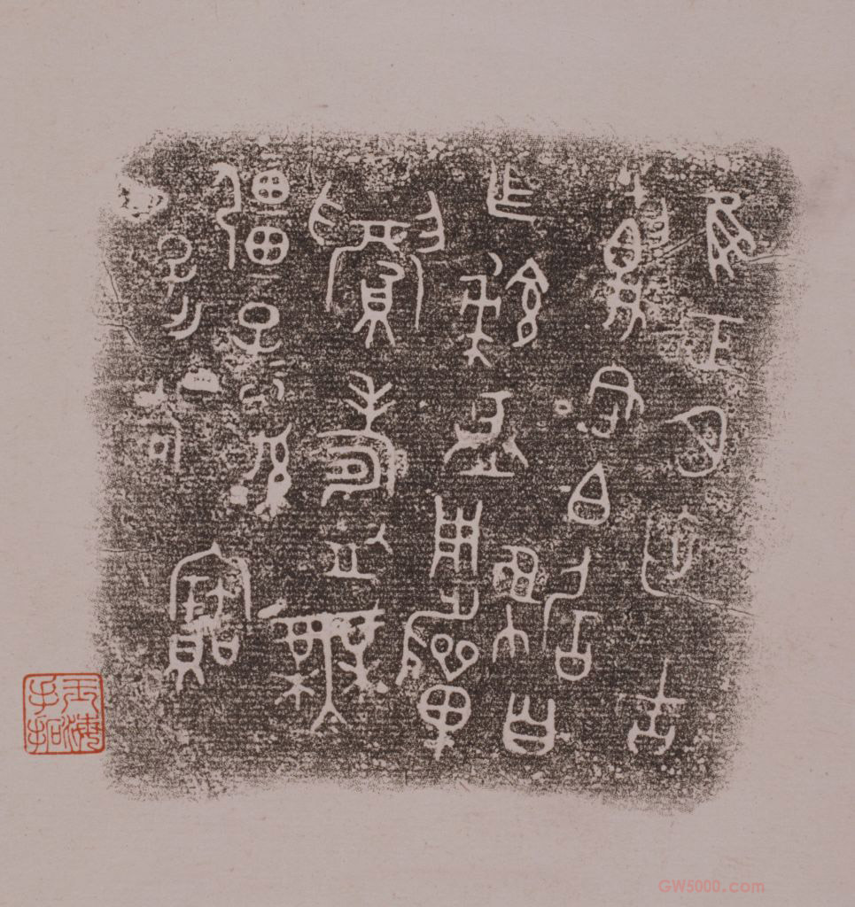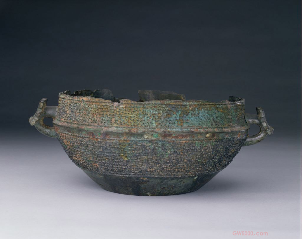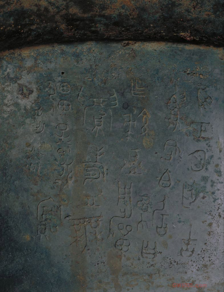 此盂敛颈,折肩,腹圜收,平底,肩上有二兽耳。颈、腹部以两周绹纹作界栏饰于主纹上下。主纹为蟠虺纹和棘刺纹,具有浓厚的地方特色。器内底有铭文6行26字: