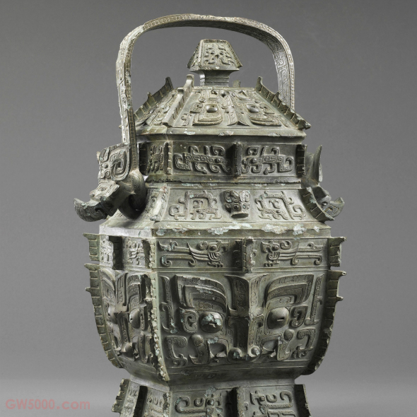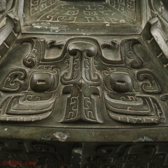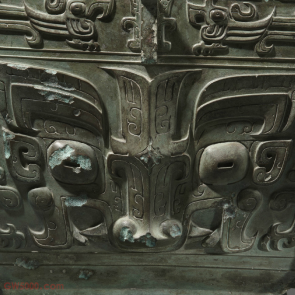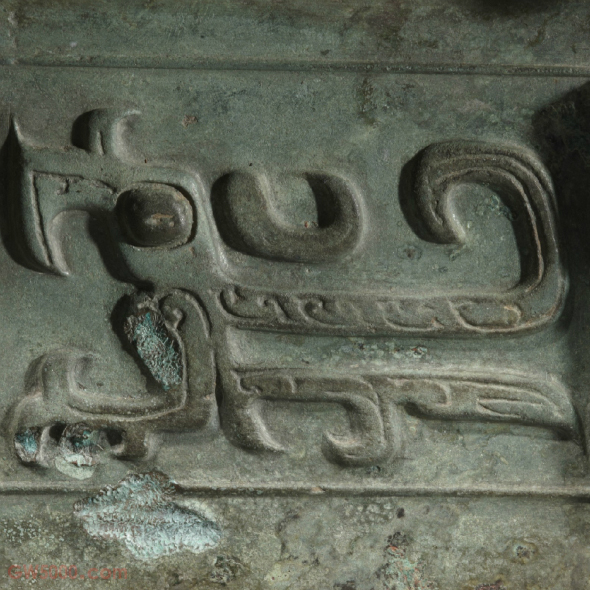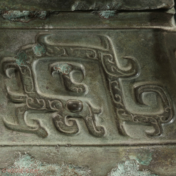 上海博物馆器呈长方形,子母口,盖作屋顶形,盖沿下折罩住器口,盖沿四周装饰两相对龙纹,以短扉棱为中心对称。整器纹饰均为高浮雕,不施地纹,眼睑、鼻梁用阴线勾勒。盖顶饰四组朝向盖钮的兽面纹。