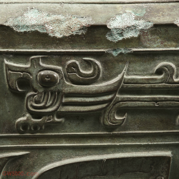 腹壁主纹为大兽面纹,椭圆形的兽目,粗眉大耳,口内有交错的獠牙,体躯和兽爪呈分解式。腹壁上端与圈足纹饰相同,均是两两相对的鸟纹,以短扉棱为中心对称。颈部两侧设圆环套铸提梁,圆环外附兽首饰,兽角为两条卷龙,装饰华丽,吐舌上卷,舌外侧饰蝉纹。扁平状的提梁外侧饰交叠的双首龙纹。提梁内侧饰变形兽目纹。器盖同铭三行16字。