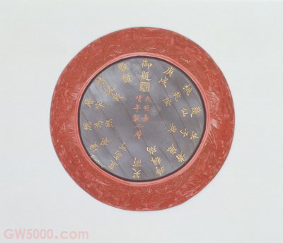 盘外壁纹饰与盘内相同,漆层浅薄,纹饰平整,为嘉靖时期的典型器物,但最大的一件盘底漆亮如新,有刀刻填金“乾隆年制”楷书款,显系后刻。款旁粘有一黄纸签,墨书“乾隆五十四年十一月初三日收古董房呈览红雕漆圆盘一件,缺漆蜡补。”由此可见,此盘上的乾隆年款是在乾隆五十四年冬将此器经古董房呈览后经修整髹漆后刻上去的。据弘历题诗可知,此套盘当是明代宫廷中道教醮坛上的供器。雕漆品种之一,又名“雕红漆”或“红雕漆”。此技法成熟于宋元时期,发展于明清两代。明黄成《髹饰录·坤集·雕镂第十·剔红》中写道:“剔红,即雕红漆也。……宋元之制,藏锋清楚,隐起圆滑,纤细精致。”其法常以木灰、金属为胎,在胎骨上层层髹红漆,少则八九十层,多达一二百层,至相当的厚度,待半干时描上画稿,然后再雕刻花纹。一般以锦纹为地,花纹隐起,华美富丽。根据漆色的不同,有剔红、剔黄、剔绿、剔黑、剔彩、剔犀之分,其中以剔红器最多见。亦称火纹。《周礼·考工记》有“火以圜”之记载。火纹是太阳的标志,因此其特征是圆形的,中间略有突起,沿边有4到8道旋转的弧线,表示光焰的流动。在青铜器上最早的涡纹见于二里头文化期的斝腹部。从二里头文化期直至战国都可在器物上见到涡纹装饰。  又称黄麻纸。即以本色麻纸染以黄檗(又称黄柏,芸香科落叶乔木,皮中有生物碱-小柏碱,既是染料,又是杀虫防蛀剂)树汁而成。古代素以黄色为贵,自魏晋至唐宋时期,染黄纸最为盛行。黄纸多用于写经,也是皇帝书写诏书的常用纸张。科举甲科进士及第者的名单均用黄纸书写,固有“黄甲”、“金榜”之称。殿试时皇帝用黄纸书写而发布的文告又称“黄榜”。近年来在我国敦煌石窟发现的写经大都为黄纸,于此可见我国染纸加工技艺历史之悠久。
