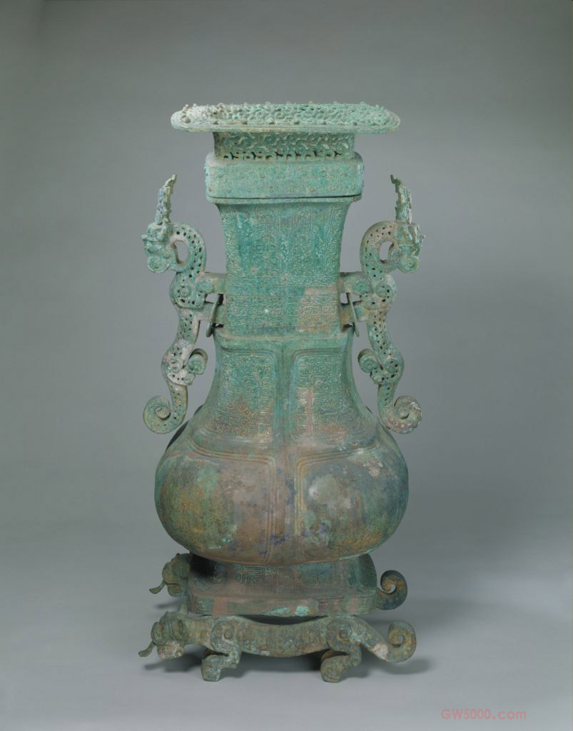 此壶有盖,盖似华冠。直口厚唇,束颈修长似扁方筒,鼓腹,圆形底。颈饰蕉叶纹,颈两侧附一对壮硕的龙形耳,龙回首卷尾呈蹲立状,双龙耳上铸有细缕孔。腹饰界栏状凸棱,上区饰蟠虺纹,下区光素无纹。圈足饰蟠虺纹和云纹,足下卧二虎。此壶造型优雅,纹饰繁缛精美,龙虎上下呼应,栩栩如生。方壶,中国古代传说中的三座神山之一,也称为“方丈”。《史记·秦始皇本纪》载:“齐人徐市等上书,言海中有三神山,名曰蓬莱、方丈、瀛洲,仙人居之。”又《封禅书》云:“自威、宣、燕昭,使人入海求蓬莱、方丈、瀛洲。此三神山者,其传在渤海中,去人不远。患且至,则船风引而去。盖尝有至者,诸仙人及不死之药皆在焉。其物、禽兽尽白,而黄金、银为宫阙。未至,望之如云,及到,三神山反居水下。临之,风辄引去,终莫能至云。”又晋人王嘉所撰《拾遗记》卷一称,三座神山由于其形如壶器,又分别被称为方壶、蓬壶、瀛壶,并称“三壶”。盛酒器,亦可盛水。《仪礼·聘礼》:“八壶设于西序”。注:“酒尊也。”《周礼·挈壶氏》:“掌挈壶以令军井”。注:“盛水器也。”殳季良父壶铭:“用盛旨酒。”伯陭壶铭:“用自作醴壶。”都十分清楚地说明了壶在青铜礼器组合中的用途。青铜壶的制作上起殷商,下至秦汉,商代前期方壶较少见,随着时代的变迁,形制也不断变化,大多为圆形。