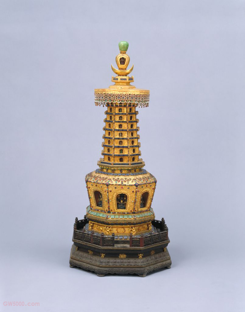 金嵌宝石八角塔,清,通高122厘米,底边长23厘米。 此塔是典型的藏式塔(和欢塔)形式,但其腹部八方开龛,七层塔轮上复开小龛供奉小像,构思颇有创意,显然借鉴了汉地建筑中墙龛和塔龛的思路。塔身遍饰珍珠、宝石,显示出皇家工艺品的特色。 八角塔是相当独特的塔形,在藏区极为罕见,故宫的佛堂中保存数量也不多。此塔兼具汉、藏两种风格,更为难得。钟表零件之一。源于法文fusee,其意是重叠盘起来的槽,外形底大顶小,看似一座宝塔,中国人直呼其为塔轮。塔轮与发条、链条一起组成钟表的动源。