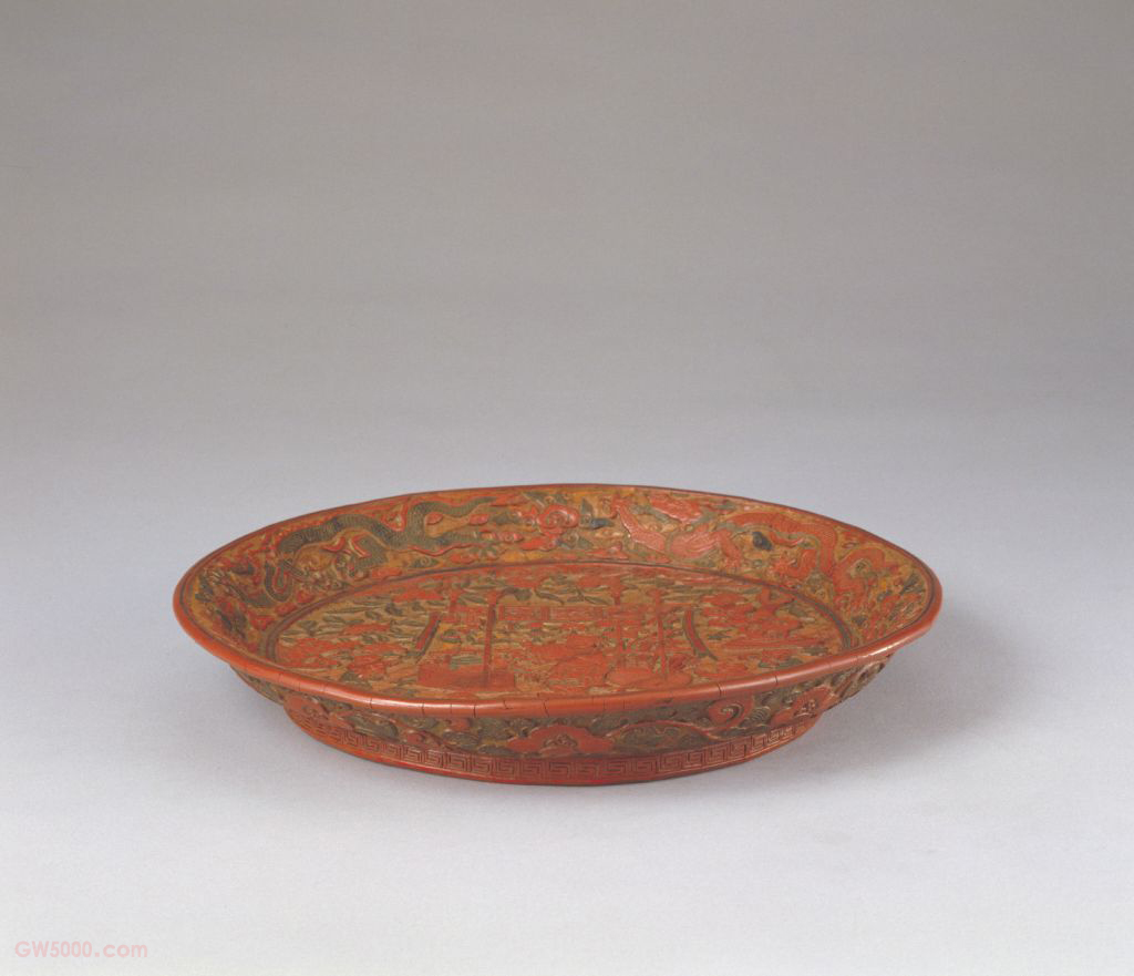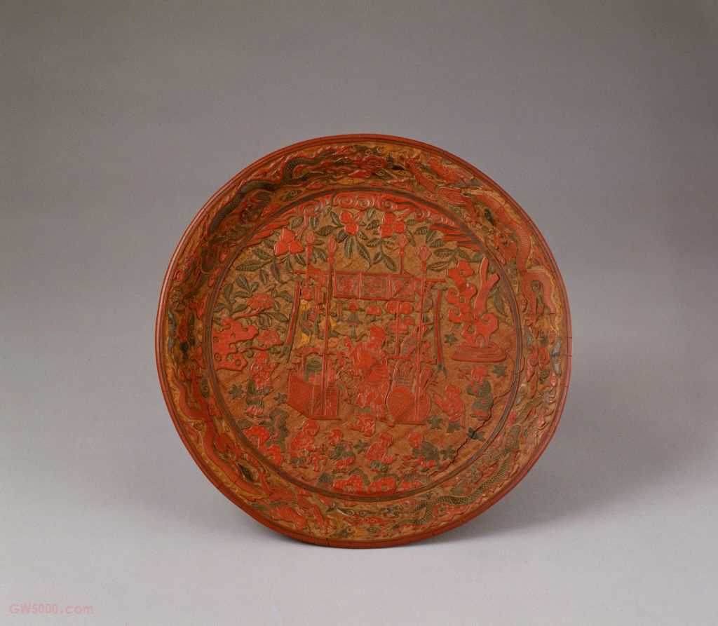 此盘漆质干涩灰暗,但漆色运用精美独到。这一时期的漆色虽仍以红、黄、绿为主,但已有同一颜色的色差之别。孩童着装与花叶红绿相间,由红绿渐黄,随妆露色,浓淡适宜。绘画题材被运用到雕漆作品中,使剔彩漆器表现出崭新的面貌。此盘画面应为师南宋画家苏汉臣的“货郎图”之作。 雕漆品种之一,亦称雕彩漆。其技法是用多种色漆分层涂于器物表面,雕刻时分层取色,其花纹五色斑斓。
