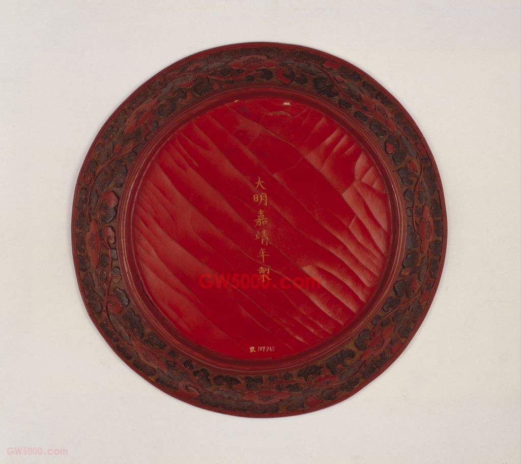 此盘通体剔彩,自下而上髹土黄、红、黄、绿、红五层漆。盘内圆形开光雕货郎图。正中一老者手持鼗鼓,后置货郎担,四周有八童子欢购嬉戏,背景为桃树山石。画面以红漆为主,间绿、黄等色,并以黄漆刻天地锦纹。盘边刻红、绿龙纹。盘背边为剔彩灵芝纹。足内髹红漆,正中有刀刻填金楷书“大明嘉靖年制”六字竖行款。