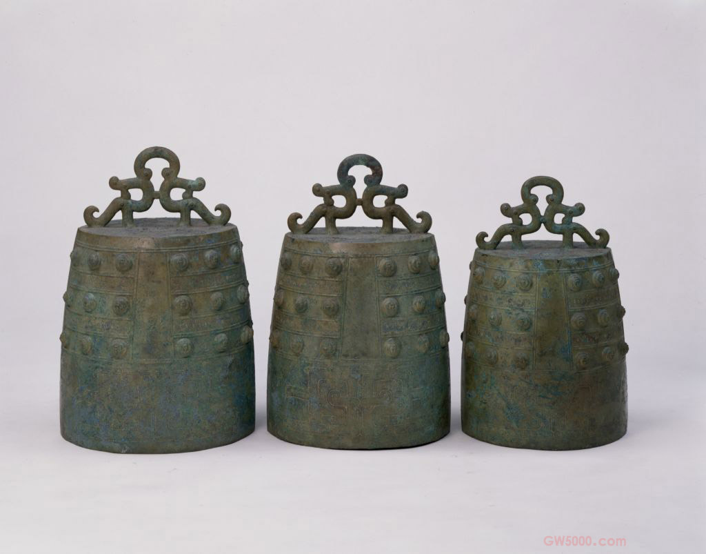 蟠螭纹编镈(3件),春秋后期,通高61.4厘米,宽41.3厘米,重34kg;通高61厘米,宽39.5厘米,重31kg;通高56.3厘米,宽36.3厘米,重30kg。