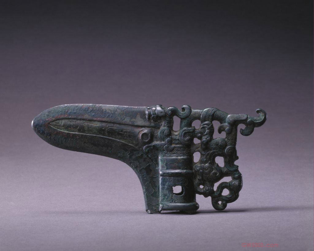 此戈造型新颖独特,漂亮的镂空纹饰使人耳目一新。商周时期最为常见的一种青铜武器,古称勾兵,由戈头、柲、柲冒和柲末的鐏组成。