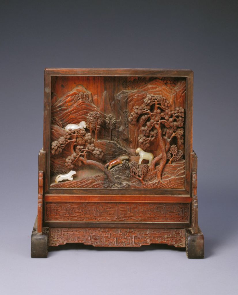 清乾隆。 插屏正面为图,背后为御制诗文。此屏为纪念西域爱乌罕进贡四匹骏马一事而制作。爱乌罕即为今日阿富汗地区。插屏属于带座屏风的一种,通常由屏框、屏心、站牙、立柱、绦环板和抱鼓墩组成。插屏的屏心分为正面和背面,正面多用木雕镶嵌、牙雕镶嵌、髹漆描金等装饰手法刻画山水、人物、风景等内容,极为美观,背面一般镶嵌诗句,或为素板。这种屏风在明清两代风行一时,在清宫帝王和后妃的寝宫中随处可见。