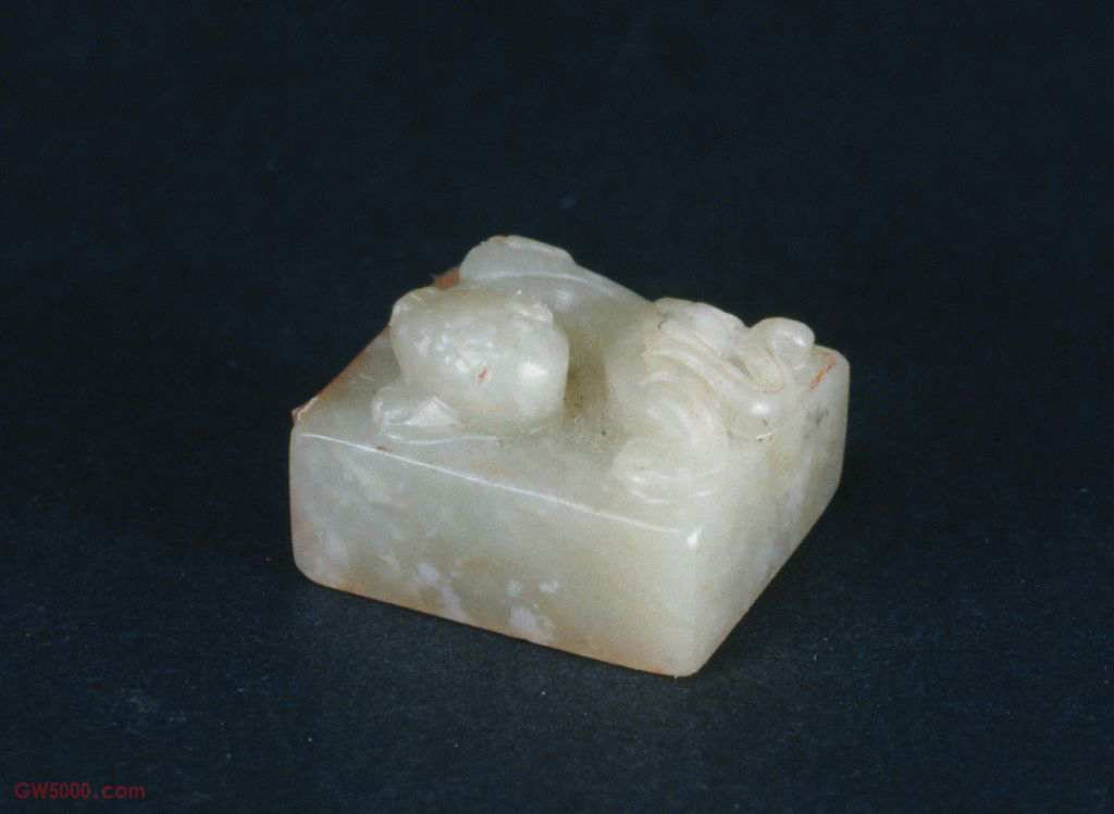 “众花胜处松千尺”印,清雍正(乾隆为宝亲王时期),白玉质,螭纽长方形玺。篆书。面宽1.7厘米,长1.9厘米,通高1.4厘米,纽高0.8厘米。