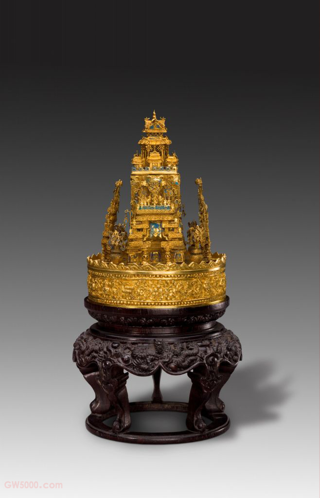 金点翠坛城,清,通座高23厘米,底座最大径13厘米。点翠工艺十分复杂,先以金属制成特定的架子,用金属线勾勒出图案纹样,然后在线条间的凹陷处粘贴翠鸟的羽毛。用点翠工艺装饰的器物色彩鲜艳,精美华丽。梵文音译为“曼陀罗”或“曼达”、“满达”。据佛经记载,印度密教修法时,为防止外道“魔众”侵入,在修法处划定界线或修建土坛,并在上面设置诸佛像,表示诸佛聚集或轮圆具足。后来,修法时设置的坛和划定的界线被称为坛城或曼荼罗。坛城以立体或平面的方、圆几何形并塑或绘以神像法器,表现诸神的坛场和宫殿,比喻佛教世界的结构。由于密教修法的内容不同,坛城的设置形式和内容(陈设品)也各不相同,极其复杂。为便于人们修行,后人据其内容以金、石、木、泥(土)等材料和绘画方式分别制成样式不同、大小不一的坛城,以表示不同的佛陀世界,陈设于佛堂,以供观想。雨花阁内3座掐丝珐琅坛城是国内最大的立体坛城,圆形底盘直径3.65m,正中为蓝色正方形供台,高0.7m,每边长1.69m。供台侧面分四色,北红,南白,西黄,东蓝,每面上嵌1个杵头。供台上是正方体宫殿,开四门,每门前装饰华丽的五彩牌坊,殿内供主尊神与侍从神,周围装点幡幢、白辕、飞天等。坛城亦是极为精美的艺术品。