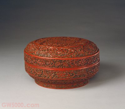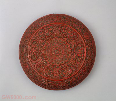 盒圆形,红漆平盖。盖面中心雕盛开的莲花一朵,周边环绕花卉。盖立壁与盒身均饰6个如意头形开光,内刻宝相花,开光间以缠枝灵芝纹相隔。花纹间露黄色地,无锦纹。此盒刻工娴熟,打磨圆润。