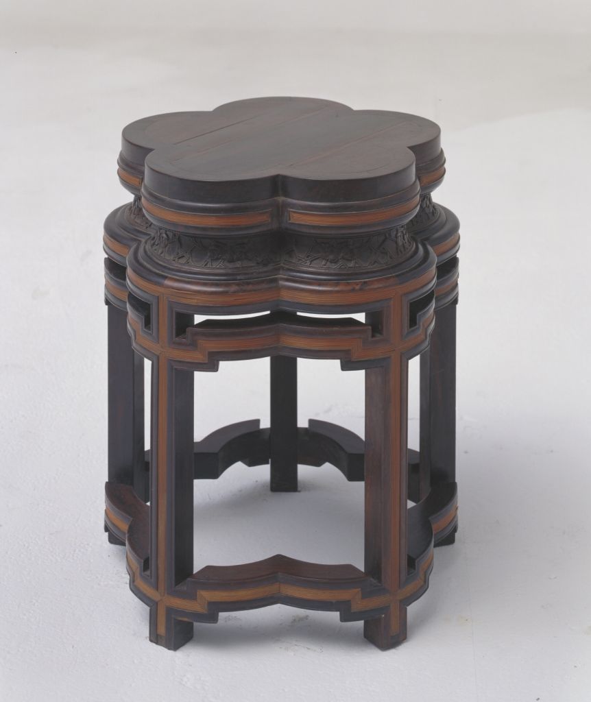 清中期,高46厘米,面径34厘米。 凳为五腿梅花式,紫檀光素座面,侧围牙子、罗锅枨,腿部正中起槽,当中填嵌竹丝,打洼束腰,浮雕冰梅纹。此凳造型优美,小巧精制,在做工和色调的处理上更是恰到好处,为清中期苏式作品。一般指设置在桌案的面框或束腰下、连接于两腿之间的部件。设于其它部位的则常称牙条。古代家具中凡两端低中间高,形如罗锅的枨子皆可称为“罗锅枨”。漆工艺门类之一。凡在漆器上阴刻花纹,然后用漆或金、银、螺钿等物填入阴纹内的做法,皆属填嵌工艺。 1. 家具工艺术语。家具线脚起阳线而又在其正中做出凹面的称作“打洼”。两道并列称“双打洼”,一道的称“单打洼”。<BR> 2. 一种玉器制作的工艺手法,一般采用打磨减地方式做出凹沟似的造型。 束腰,明清家具部件名称。原是须弥座上枭与下枭之间的部分,在家具上指面框和牙条之间缩进的部。束腰是我国传统家具造型的典型式样之一。在平面上雕出凸起的纹饰或物象的一种雕塑。按凸起高度的不同,可分为高浮雕、深浮雕、浅浮雕等,也有几种雕刻技法结合使用的形式,多见于高精繁杂的雕刻作品。 以短材斜角拼接成的一种纹饰,形似冰面裂纹,名曰冰裂纹,常与梅花作组合图案。 明清时期我国家具的四个主要产地之一。四地为苏式、广式、京式、晋式(又称苏作、广作、京作、晋作)。
