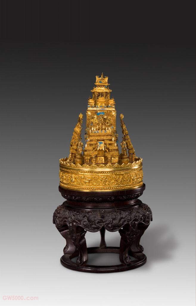 金点翠坛城,清,通座高23厘米,底座最大径13厘米。点翠工艺十分复杂,先以金属制成特定的架子,用金属线勾勒出图案纹样,然后在线条间的凹陷处粘贴翠鸟的羽毛。用点翠工艺装饰的器物色彩鲜艳,精美华丽。梵文音译为“曼陀罗”或“曼达”、“满达”。据佛经记载,印度密教修法时,为防止外道“魔众”侵入,在修法处划定界线或修建土坛,并在上面设置诸佛像,表示诸佛聚集或轮圆具足。后来,修法时设置的坛和划定的界线被称为坛城或曼荼罗。坛城以立体或平面的方、圆几何形并塑或绘以神像法器,表现诸神的坛场和宫殿,比喻佛教世界的结构。由于密教修法的内容不同,坛城的设置形式和内容(陈设品)也各不相同,极其复杂。为便于人们修行,后人据其内容以金、石、木、泥(土)等材料和绘画方式分别制成样式不同、大小不一的坛城,以表示不同的佛陀世界,陈设于佛堂,以供观想。雨花阁内3座掐丝珐琅坛城是国内最大的立体坛城,圆形底盘直径3.65m,正中为蓝色正方形供台,高0.7m,每边长1.69m。供台侧面分四色,北红,南白,西黄,东蓝,每面上嵌1个杵头。供台上是正方体宫殿,开四门,每门前装饰华丽的五彩牌坊,殿内供主尊神与侍从神,周围装点幡幢、白辕、飞天等。坛城亦是极为精美的艺术品。