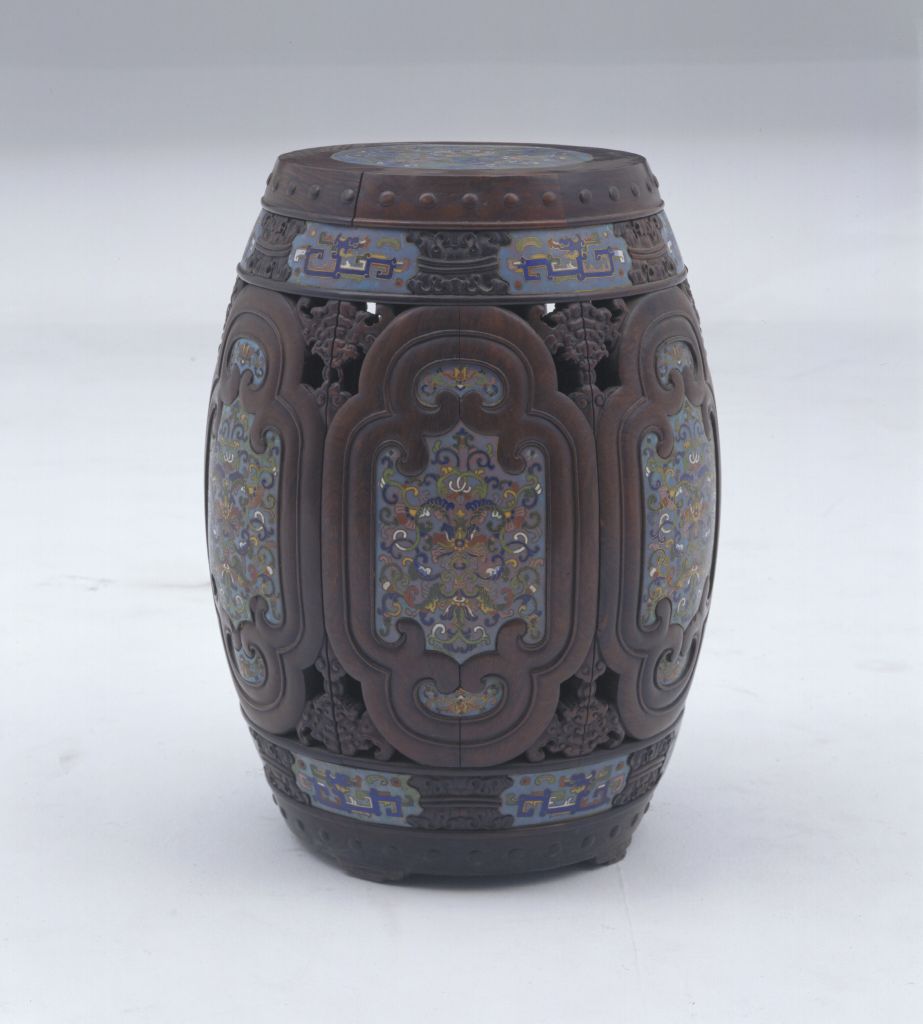 清,通高52厘米,面径28厘米。 绣墩造型仿腰鼓,面、底径相若。上下两端各雕玄纹两道,玄纹外侧浮雕象征固定鼓皮的乳钉,玄纹之间以浮雕卷草纹卡子花界出六格,每格各嵌夔龙纹珐琅片一块。腹腔中间为六组海棠式开光,彼此衔接。开光内另镶紫檀木板,边缘雕出云纹圈,当中镶蝙蝠纹及宝相花纹珐琅片。古代一种常用的坐具,因其上面常覆盖一方丝绣之物而得名,又名“锦墩”、“鼓墩”或“坐墩”,可用草、藤、木、漆木、瓷、石等材质制成,造型多种多样,往往在亲友交往等非正式场合中使用。 亦称拍鼓,西域乐器。原为木腔,两端蒙牛皮,牛皮周边穿若干皮条,将皮条集束于鼓的中间部分,以控制皮条的松紧。演奏时,将鼓放在腿上用手拍击,或挂于胸前边击边舞。敦煌莫高窟和云冈石窟的壁画中就有大量的唐代乐伎拍击腰鼓的生动形象。 在平面上雕出凸起的纹饰或物象的一种雕塑。按凸起高度的不同,可分为高浮雕、深浮雕、浅浮雕等,也有几种雕刻技法结合使用的形式,多见于高精繁杂的雕刻作品。 瓷器纹饰,又称卷叶纹或卷枝纹,宜于作各种器物的辅助纹饰。 17、18世纪传入中国的一种装饰花纹。俗称西蕃莲,如果没有花朵,则称为卷草。镶在两根横木中间的雕有各种纹饰的构件。 苏式彩画中的基本图形之一。位于箍头与包袱之间,靠近箍头,偶见于檩枋中部。由如意图案演变而来,多以卷草纹方式组合,图形多变,如“万”字卡子、“寿”字卡子、夔龙卡子等。各种卡子均可分为硬卡子与软卡子式样,线条直硬者称硬卡子,柔曲者称软卡子。夔,古代传说中一种奇异的动物,似龙,一足。《庄子·春秋》中记载:“夔谓蚿曰:‘吾以一足趻踔而行。’”夔纹即这种独脚龙的侧面图案。玉器上的夔纹,最早见于商、西周时期,多见于彝器上。夔纹在玉器上出现的时间很长,自商、周至今,一直在玉雕工艺纹饰中占据着重要地位,而在战国和汉代尤为兴盛。玉器上的夔纹线条比青铜器上的柔和,阴刻线除单线外,也有双刻线。 陶瓷器装饰纹样之一种。明、清两代是陶瓷器以龙纹为装饰的全盛时期,主要采用釉上、釉下彩绘方法,亦有印花、刻划等工艺。龙的体态有较多变化,常见有云龙、戏珠龙、海水龙、螭龙、行龙、立龙、正面龙、侧面龙、夔龙等。珐琅,又称“佛郎”“法蓝”“琺瑯”,是一外来语的音译词。珐琅的基本成分为石英、长石、硼砂和氟化物,与陶瓷釉、琉璃、玻璃(料)同属硅酸盐类物质。中国古代习惯将附着在陶或瓷胎表面的称“釉”;附着在建筑瓦件上的称“琉璃”;而附着在金属表面上的则称为“珐琅”。 金属胎珐琅器则依据在制作过程中具体加工工艺的不同,可分为掐丝珐琅器、錾胎珐琅器、画珐琅器和透明珐琅器等几个品种。指墩类家具中间最粗的部位。落叶小乔木,叶子呈椭圆形,花白色或淡粉红色。果实亦称海棠,球形,味酸甜。 我国传统装饰技法之一。即为使器物上的装饰变化多样或突出某一形象,往往在器物的某一部位勾勒出某一形状(如扇形、蕉叶形、菱形、心形、桃形、圆形等)的空间,其内饰以图纹。 紫檀木是世界上最名贵的木材之一,主要产于南北回归线之间的热带、亚热带地区,我国广东、云南等地有少量出产。其木质坚硬,体重,入水即沉,没有疤痕,呈紫黑色。紫檀木生长缓慢,非数百年不能成材,故极珍贵。紫檀木的纹理纤细浮动,变化无穷,其色调深沉,显得稳重、大方、美观。《博物要览》称:“新者色红,旧者色紫,有蟹爪纹,新者以水浸之,可染物。”我国古代使用紫檀木制作器物历史悠久,东汉末年已见于记载,唐代宫廷中亦有使用紫檀木的记载。至明代,紫檀木更是受到皇家的宠爱。清代,紫檀木大量进入宫廷中,为内务府造办处用于制作清宫家具及文玩之器的必备材料,同时一些富商大贾之家也多使用名贵的紫檀木制造家具及生活用品。 我国传统装饰纹样之一, 又称“宝仙花”、“宝花花”。一般以某种花卉(如牡丹、莲花)为主体,中间镶嵌形状不同、大小粗细有别的其它花叶,尤其在花芯和花瓣基部,用圆珠作规则排列,似闪闪发光的宝珠,富丽华美,故名宝相花。盛行于隋唐时期,元明清时期的器物上亦多以之为装饰题材。