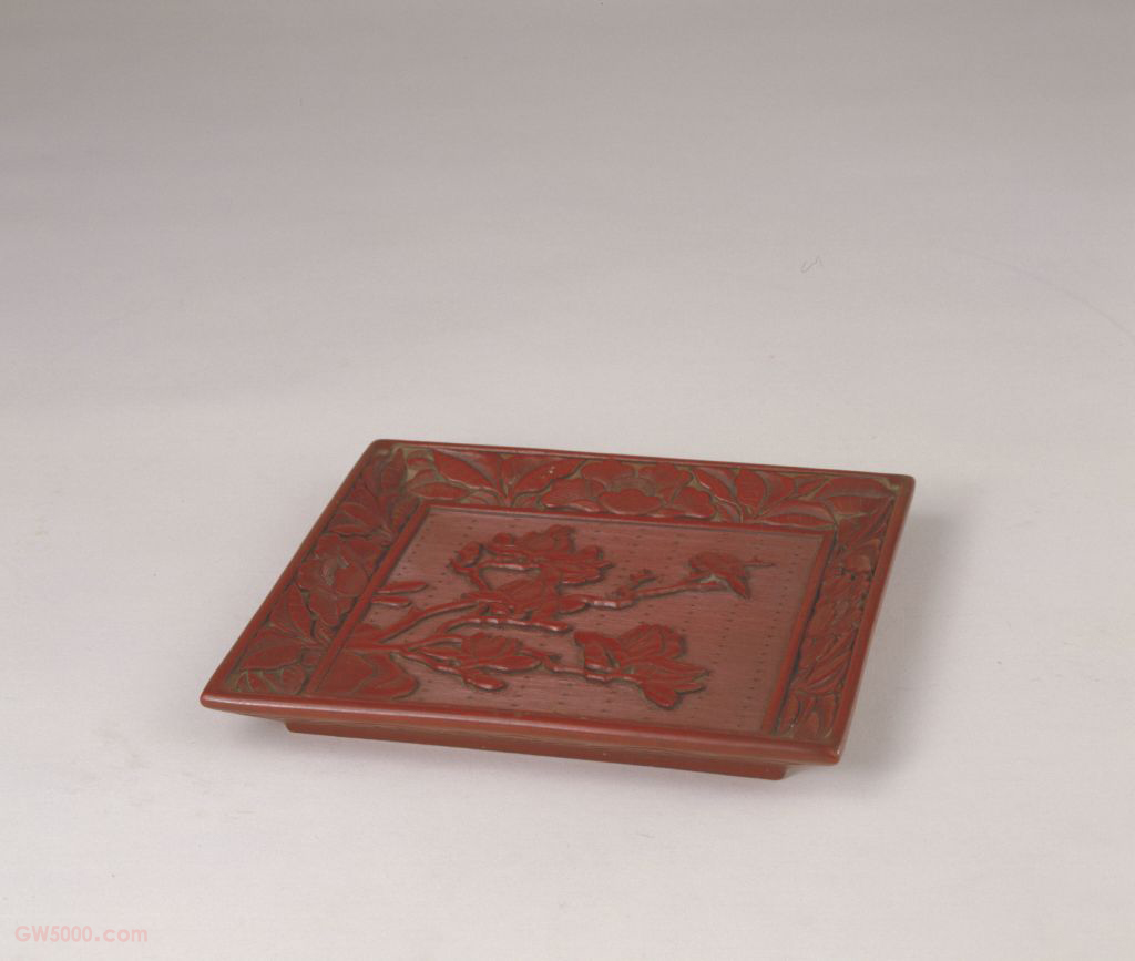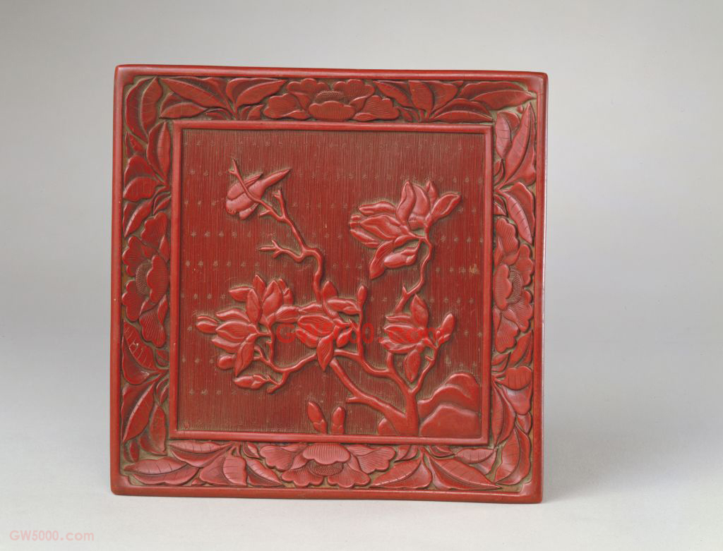 剔红玉兰山禽图方盘,明中期,高2.2厘米,口径18厘米。清宫旧藏。